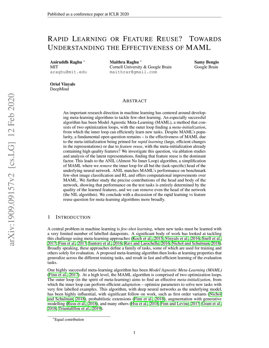 Rapid Learning or Feature Reuse? Towards Understanding the Effectiveness