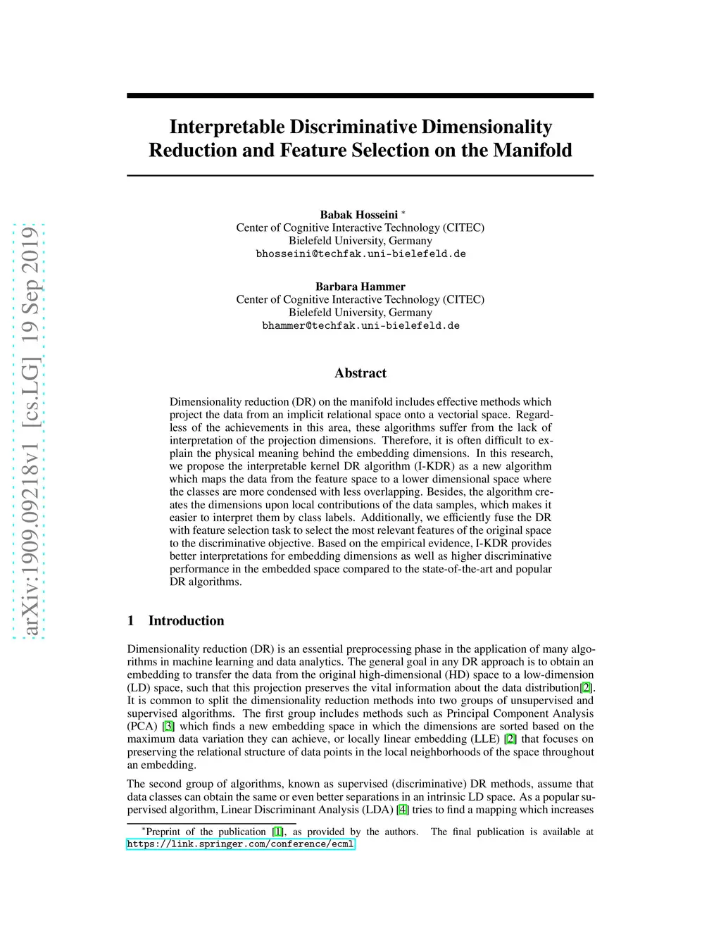 Interpretable Discriminative Dimensionality Reduction and Feature