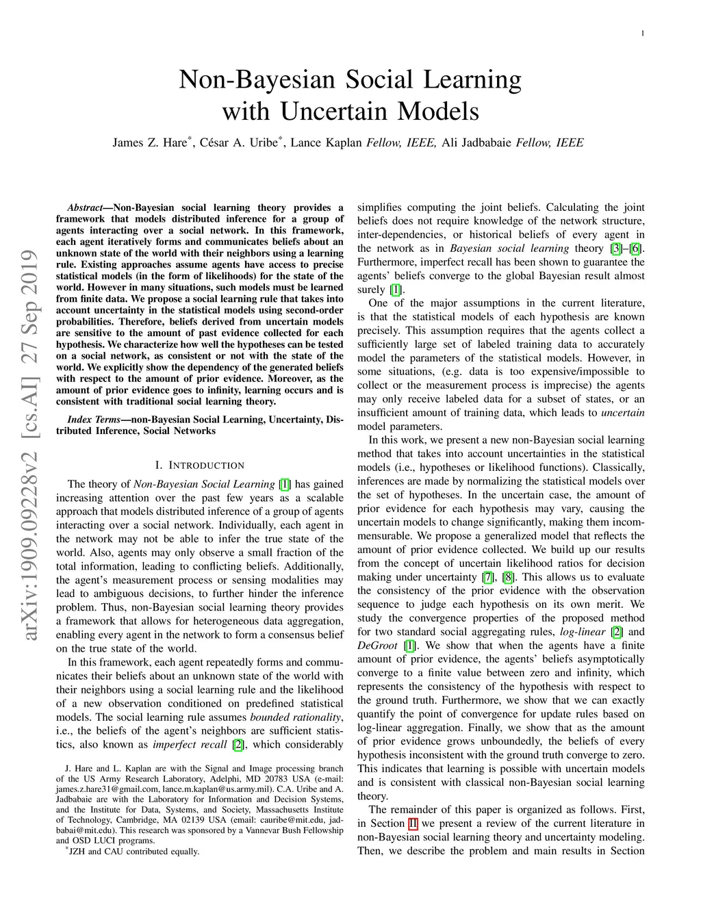 Non-Bayesian social learning theory provides a framework that models distributed inference for a group of agents interacting over a social network. In this framework, each agent iteratively forms and communicates beliefs about an unknown state of the world with their neighbors using a learning rule. Existing approaches assume agents have access to precise statistical models (in the form of likelihoods) for the state of the world. However in many situations, such models must be learned from finite data. We propose a social learning rule that takes into account uncertainty in the statistical models using second-order probabilities. Therefore, beliefs derived from uncertain models are sensitive to the amount of past evidence collected for each hypothesis. We characterize how well the hypotheses can be tested on a social network, as consistent or not with the state of the world. We explicitly show the dependency of the generated beliefs with respect to the amount of prior evidence. Moreover, as the amount of prior evidence goes to infinity, learning occurs and is consistent with traditional social learning theory.