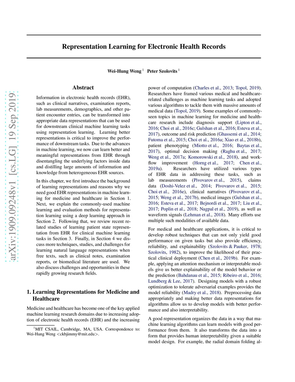 Information in electronic health records (EHR), such as clinical narratives, examination reports, lab measurements, demographics, and other patient encounter entries, can be transformed into appropriate data representations that can be used for downstream clinical machine learning tasks using representation learning. Learning better representations is critical to improve the performance of downstream tasks. Due to the advances in machine learning, we now can learn better and meaningful representations from EHR through disentangling the underlying factors inside data and distilling large amounts of information and knowledge from heterogeneous EHR sources. In this chapter, we first introduce the background of learning representations and reasons why we need good EHR representations in machine learning for medicine and healthcare in Section 1. Next, we explain the commonly-used machine learning and evaluation methods for representation learning using a deep learning approach in Section 2. Following that, we review recent related studies of learning patient state representation from EHR for clinical machine learning tasks in Section 3. Finally, in Section 4 we discuss more techniques, studies, and challenges for learning natural language representations when free texts, such as clinical notes, examination reports, or biomedical literature are used. We also discuss challenges and opportunities in these rapidly growing research fields.