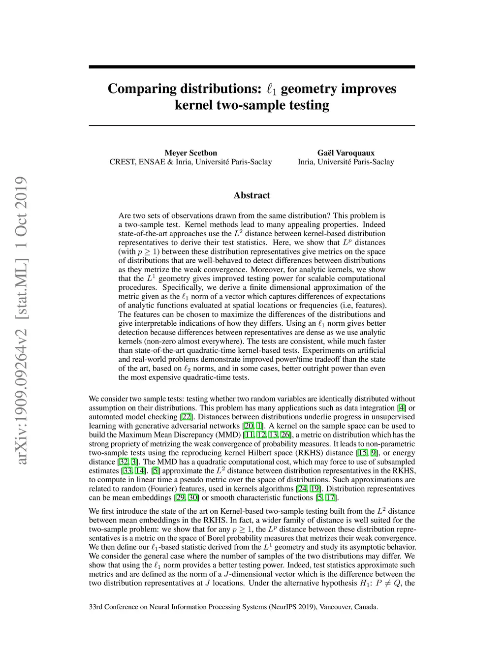 Are two sets of observations drawn from the same distribution? This problem is a two-sample test. Kernel methods lead to many appealing properties. Indeed state-of-the-art approaches use the distance between kernel-based distribution representatives to derive their test statistics. Here, we show that distances (with ) between these distribution representatives give metrics on the space of distributions that are well-behaved to detect differences between distributions as they metrize the weak convergence. Moreover, for analytic kernels, we show that the geometry gives improved testing power for scalable computational procedures. Specifically, we derive a finite dimensional approximation of the metric given as the norm of a vector which captures differences of expectations of analytic functions evaluated at spatial locations or frequencies (i.e, features). The features can be chosen to maximize the differences of the distributions and give interpretable indications of how they differs. Using an norm gives better detection because differences between representatives are dense as we use analytic kernels (non-zero almost everywhere). The tests are consistent, while much faster than state-of-the-art quadratic-time kernel-based tests. Experiments on artificial and real-world problems demonstrate improved power/time tradeoff than the state of the art, based on norms, and in some cases, better outright power than even the most expensive quadratic-time tests.