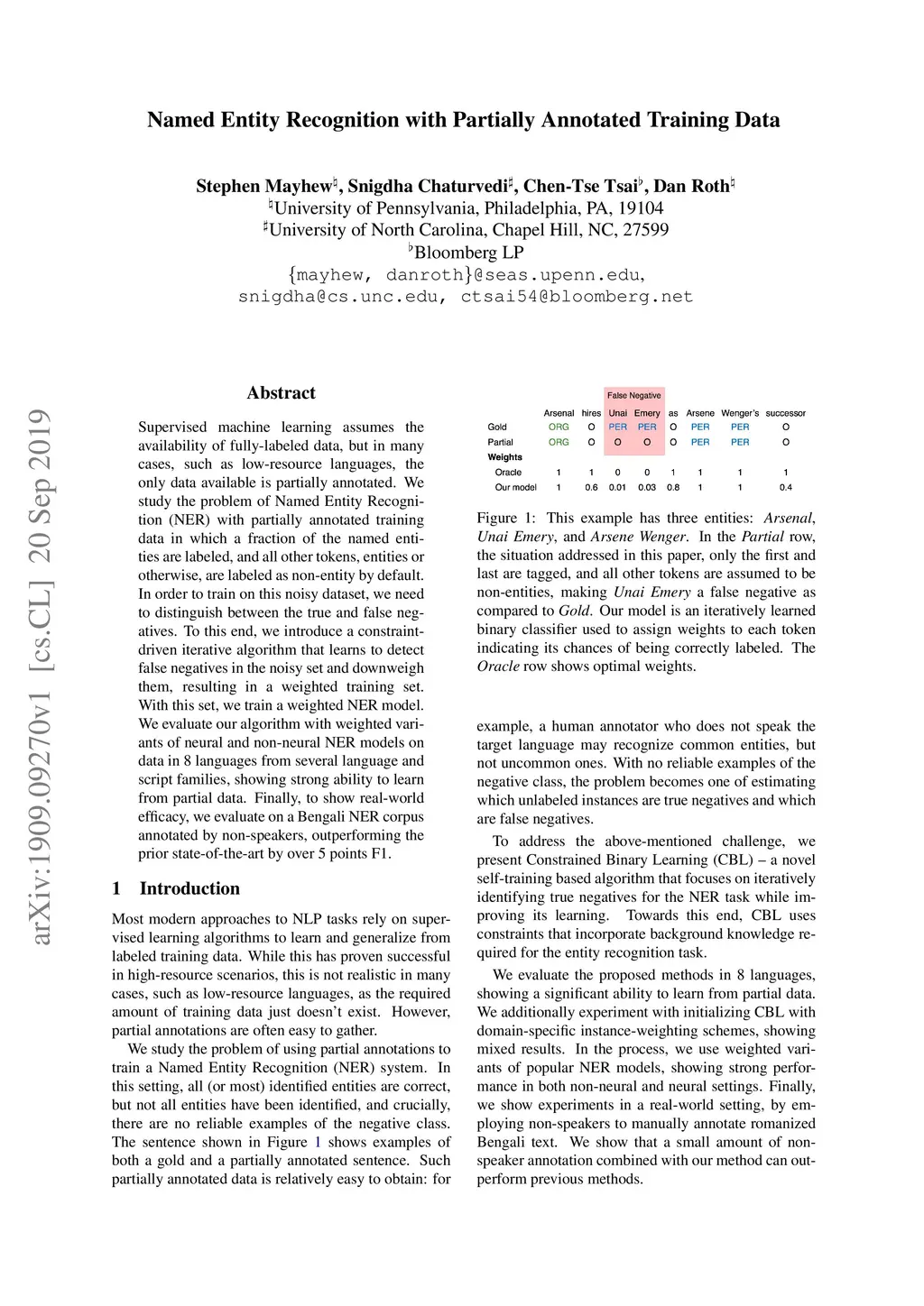 Supervised machine learning assumes the availability of fully-labeled data, but in many cases, such as low-resource languages, the only data available is partially annotated. We study the problem of Named Entity Recognition (NER) with partially annotated training data in which a fraction of the named entities are labeled, and all other tokens, entities or otherwise, are labeled as non-entity by default. In order to train on this noisy dataset, we need to distinguish between the true and false negatives. To this end, we introduce a constraint-driven iterative algorithm that learns to detect false negatives in the noisy set and downweigh them, resulting in a weighted training set. With this set, we train a weighted NER model. We evaluate our algorithm with weighted variants of neural and non-neural NER models on data in 8 languages from several language and script families, showing strong ability to learn from partial data. Finally, to show real-world efficacy, we evaluate on a Bengali NER corpus annotated by non-speakers, outperforming the prior state-of-the-art by over 5 points F1.