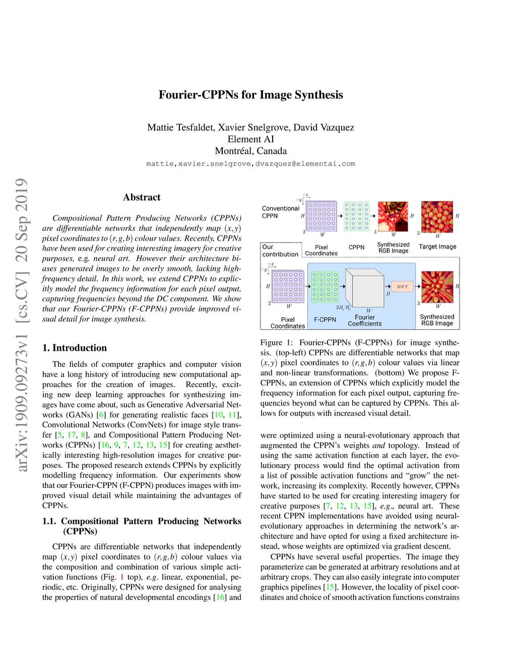 Compositional Pattern Producing Networks (CPPNs) are differentiable networks that independently map (x, y) pixel coordinates to (r, g, b) colour values. Recently, CPPNs have been used for creating interesting imagery for creative purposes, e.g., neural art. However their architecture biases generated images to be overly smooth, lacking high-frequency detail. In this work, we extend CPPNs to explicitly model the frequency information for each pixel output, capturing frequencies beyond the DC component. We show that our Fourier-CPPNs (F-CPPNs) provide improved visual detail for image synthesis.