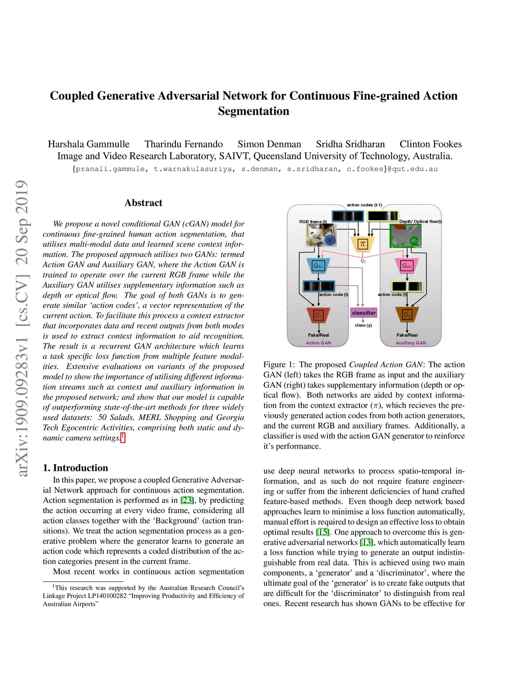 We propose a novel conditional GAN (cGAN) model for continuous fine-grained human action segmentation, that utilises multi-modal data and learned scene context information. The proposed approach utilises two GANs: termed Action GAN and Auxiliary GAN, where the Action GAN is trained to operate over the current RGB frame while the Auxiliary GAN utilises supplementary information such as depth or optical flow. The goal of both GANs is to generate similar `action codes', a vector representation of the current action. To facilitate this process a context extractor that incorporates data and recent outputs from both modes is used to extract context information to aid recognition. The result is a recurrent GAN architecture which learns a task specific loss function from multiple feature modalities. Extensive evaluations on variants of the proposed model to show the importance of utilising different information streams such as context and auxiliary information in the proposed network; and show that our model is capable of outperforming state-of-the-art methods for three widely used datasets: 50 Salads, MERL Shopping and Georgia Tech Egocentric Activities, comprising both static and dynamic camera settings.