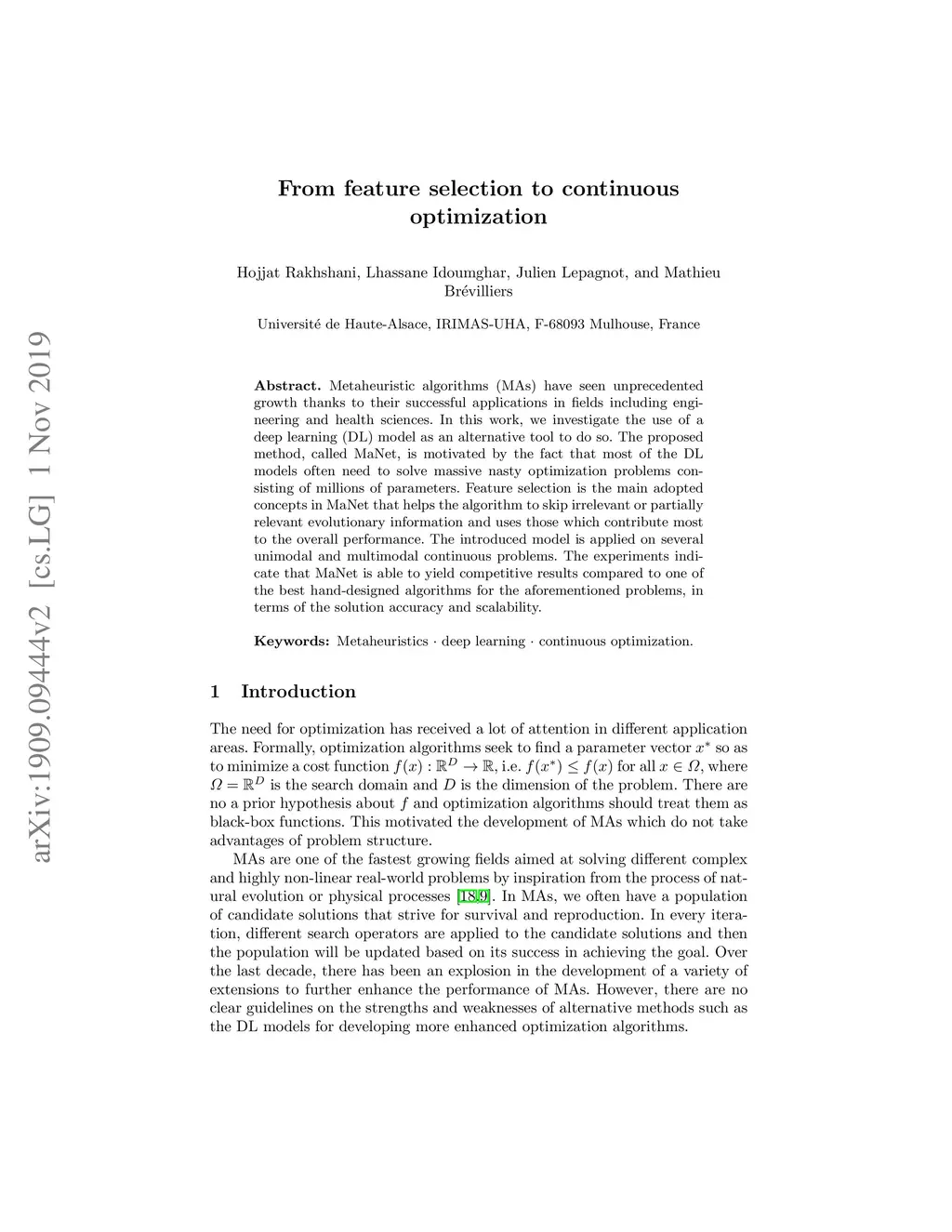 Metaheuristic algorithms (MAs) have seen unprecedented growth thanks to their successful applications in fields including engineering and health sciences. In this work, we investigate the use of a deep learning (DL) model as an alternative tool to do so. The proposed method, called MaNet, is motivated by the fact that most of the DL models often need to solve massive nasty optimization problems consisting of millions of parameters. Feature selection is the main adopted concepts in MaNet that helps the algorithm to skip irrelevant or partially relevant evolutionary information and uses those which contribute most to the overall performance. The introduced model is applied on several unimodal and multimodal continuous problems. The experiments indicate that MaNet is able to yield competitive results compared to one of the best hand-designed algorithms for the aforementioned problems, in terms of the solution accuracy and scalability.