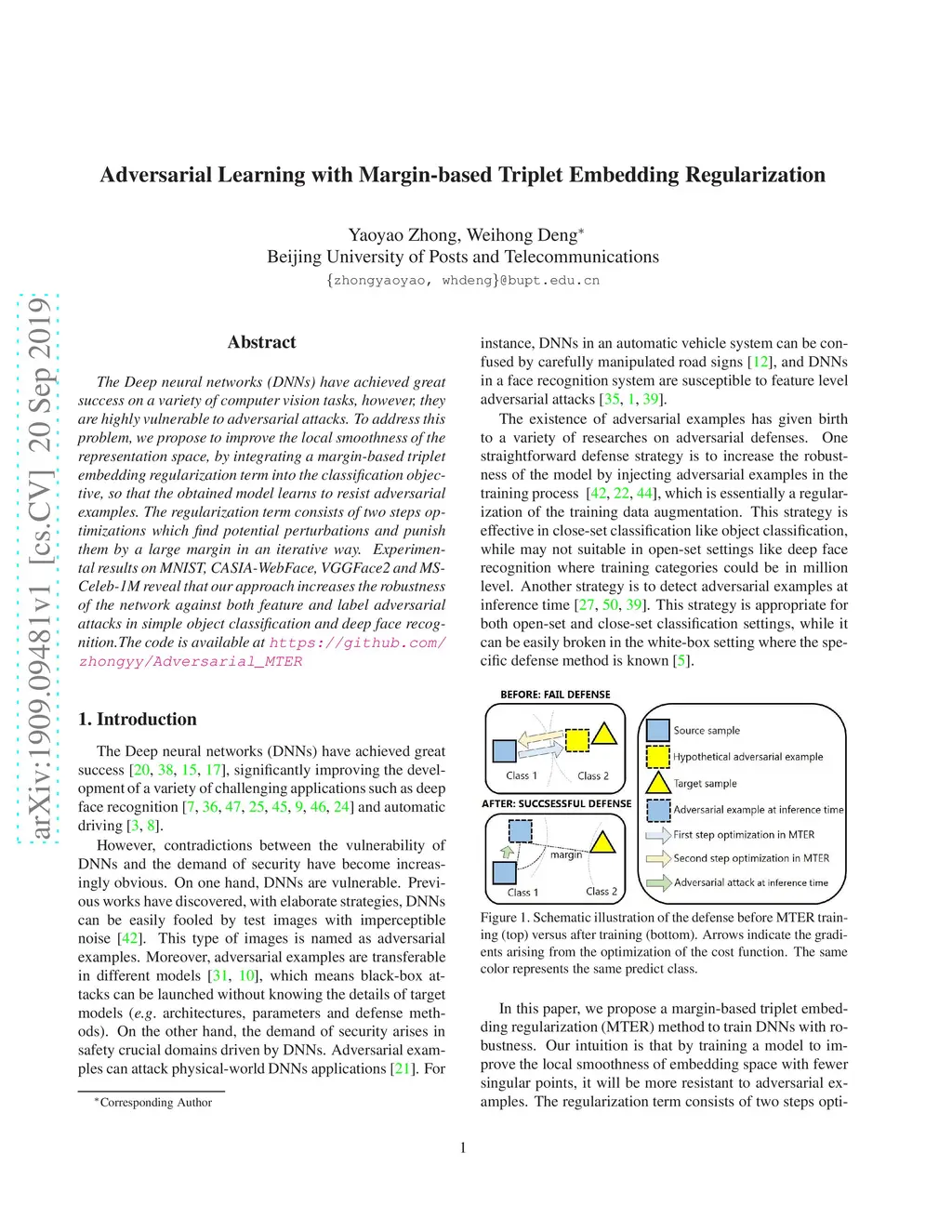 The Deep neural networks (DNNs) have achieved great success on a variety of computer vision tasks, however, they are highly vulnerable to adversarial attacks. To address this problem, we propose to improve the local smoothness of the representation space, by integrating a margin-based triplet embedding regularization term into the classification objective, so that the obtained model learns to resist adversarial examples. The regularization term consists of two steps optimizations which find potential perturbations and punish them by a large margin in an iterative way. Experimental results on MNIST, CASIA-WebFace, VGGFace2 and MS-Celeb-1M reveal that our approach increases the robustness of the network against both feature and label adversarial attacks in simple object classification and deep face recognition.