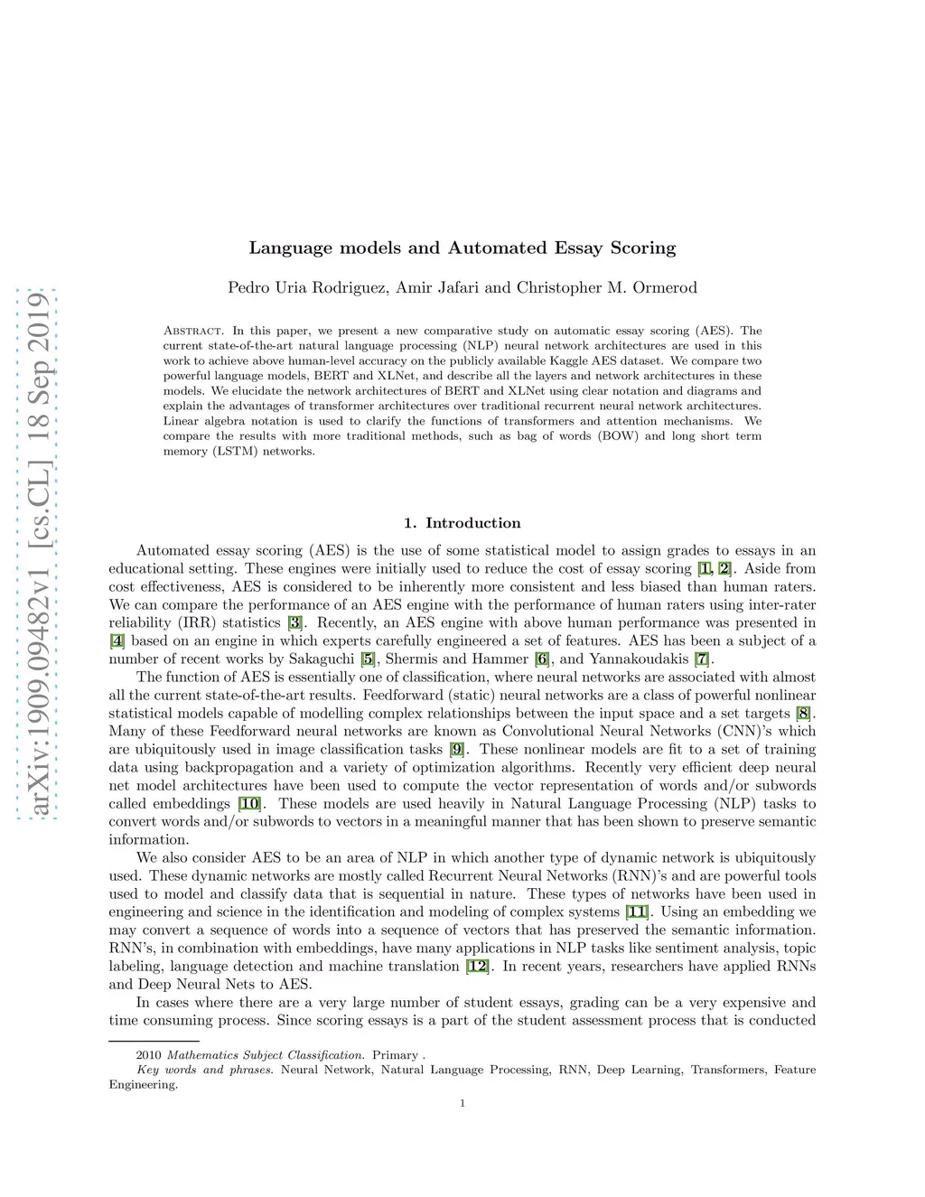 In this paper, we present a new comparative study on automatic essay scoring (AES). The current state-of-the-art natural language processing (NLP) neural network architectures are used in this work to achieve above human-level accuracy on the publicly available Kaggle AES dataset. We compare two powerful language models, BERT and XLNet, and describe all the layers and network architectures in these models. We elucidate the network architectures of BERT and XLNet using clear notation and diagrams and explain the advantages of transformer architectures over traditional recurrent neural network architectures. Linear algebra notation is used to clarify the functions of transformers and attention mechanisms. We compare the results with more traditional methods, such as bag of words (BOW) and long short term memory (LSTM) networks.
