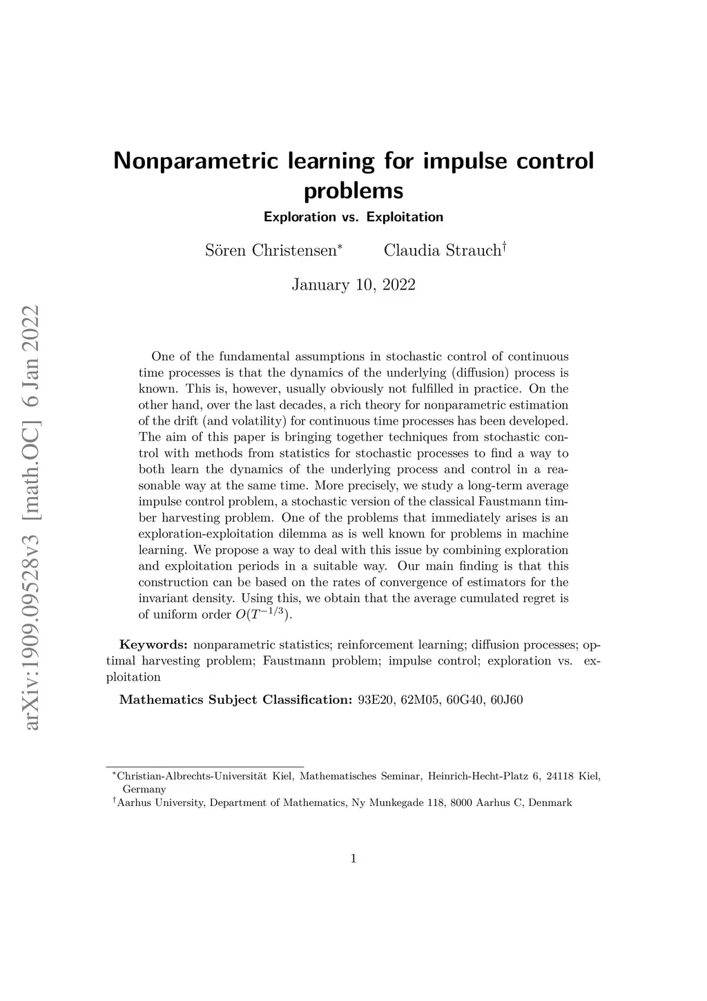 One of the fundamental assumptions in stochastic control of continuous time processes is that the dynamics of the underlying (diffusion) process is known. This is, however, usually obviously not fulfilled in practice. On the other hand, over the last decades, a rich theory for nonparametric estimation of the drift (and volatility) for continuous time processes has been developed. The aim of this paper is bringing together techniques from stochastic control with methods from statistics for stochastic processes to find a way to both learn the dynamics of the underlying process and control in a reasonable way at the same time. More precisely, we study a long-term average impulse control problem, a stochastic version of the classical Faustmann timber harvesting problem. One of the problems that immediately arises is an exploration-exploitation dilemma as is well known for problems in machine learning. We propose a way to deal with this issue by combining exploration and exploitation periods in a suitable way. Our main finding is that this construction can be based on the rates of convergence of estimators for the invariant density. Using this, we obtain that the average cumulated regret is of uniform order .