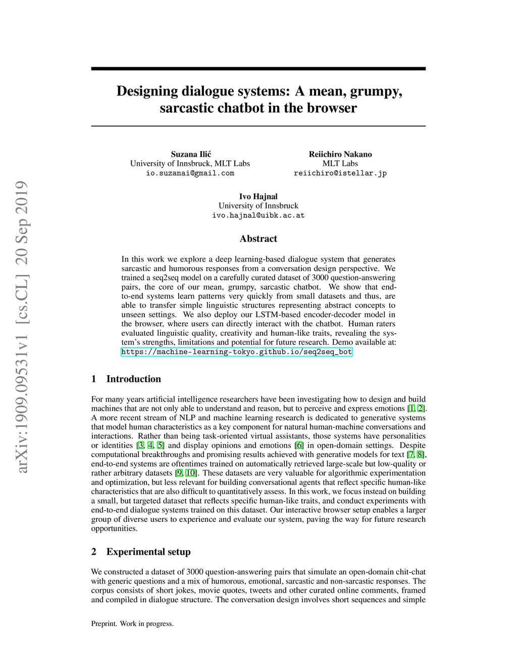 In this work we explore a deep learning-based dialogue system that generates sarcastic and humorous responses from a conversation design perspective. We trained a seq2seq model on a carefully curated dataset of 3000 question-answering pairs, the core of our mean, grumpy, sarcastic chatbot. We show that end-to-end systems learn patterns very quickly from small datasets and thus, are able to transfer simple linguistic structures representing abstract concepts to unseen settings. We also deploy our LSTM-based encoder-decoder model in the browser, where users can directly interact with the chatbot. Human raters evaluated linguistic quality, creativity and human-like traits, revealing the system's strengths, limitations and potential for future research.