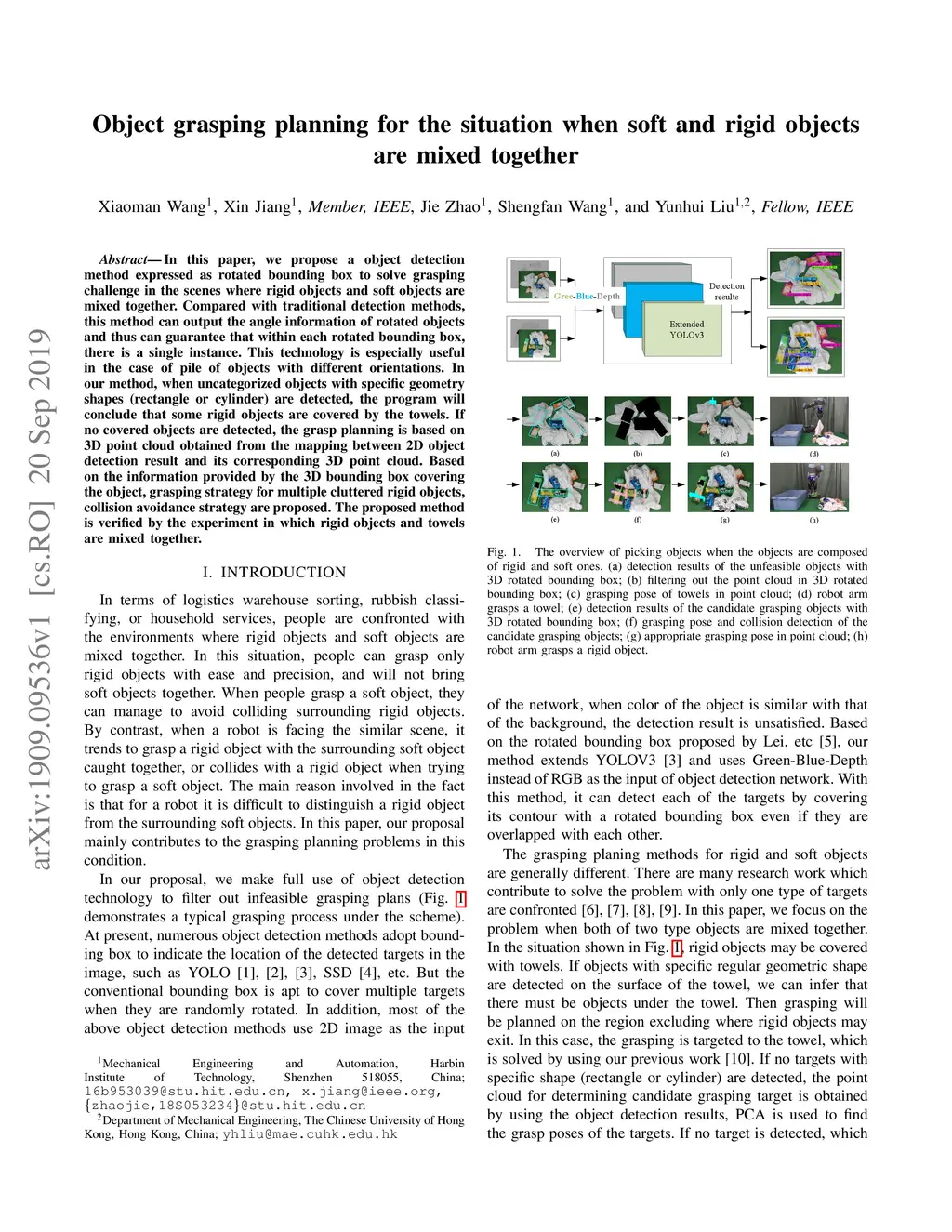 In this paper, we propose a object detection method expressed as rotated bounding box to solve grasping challenge in the scenes where rigid objects and soft objects are mixed together. Compared with traditional detection methods, this method can output the angle information of rotated objects and thus can guarantee that within each rotated bounding box, there is a single instance. This technology is especially useful in the case of pile of objects with different orientations. In our method, when uncategorized objects with specific geometry shapes (rectangle or cylinder) are detected, the program will conclude that some rigid objects are covered by the towels. If no covered objects are detected, the grasp planning is based on 3D point cloud obtained from the mapping between 2D object detection result and its corresponding 3D point cloud. Based on the information provided by the 3D bounding box covering the object, grasping strategy for multiple cluttered rigid objects, collision avoidance strategy are proposed. The proposed method is verified by the experiment in which rigid objects and towels are mixed together.