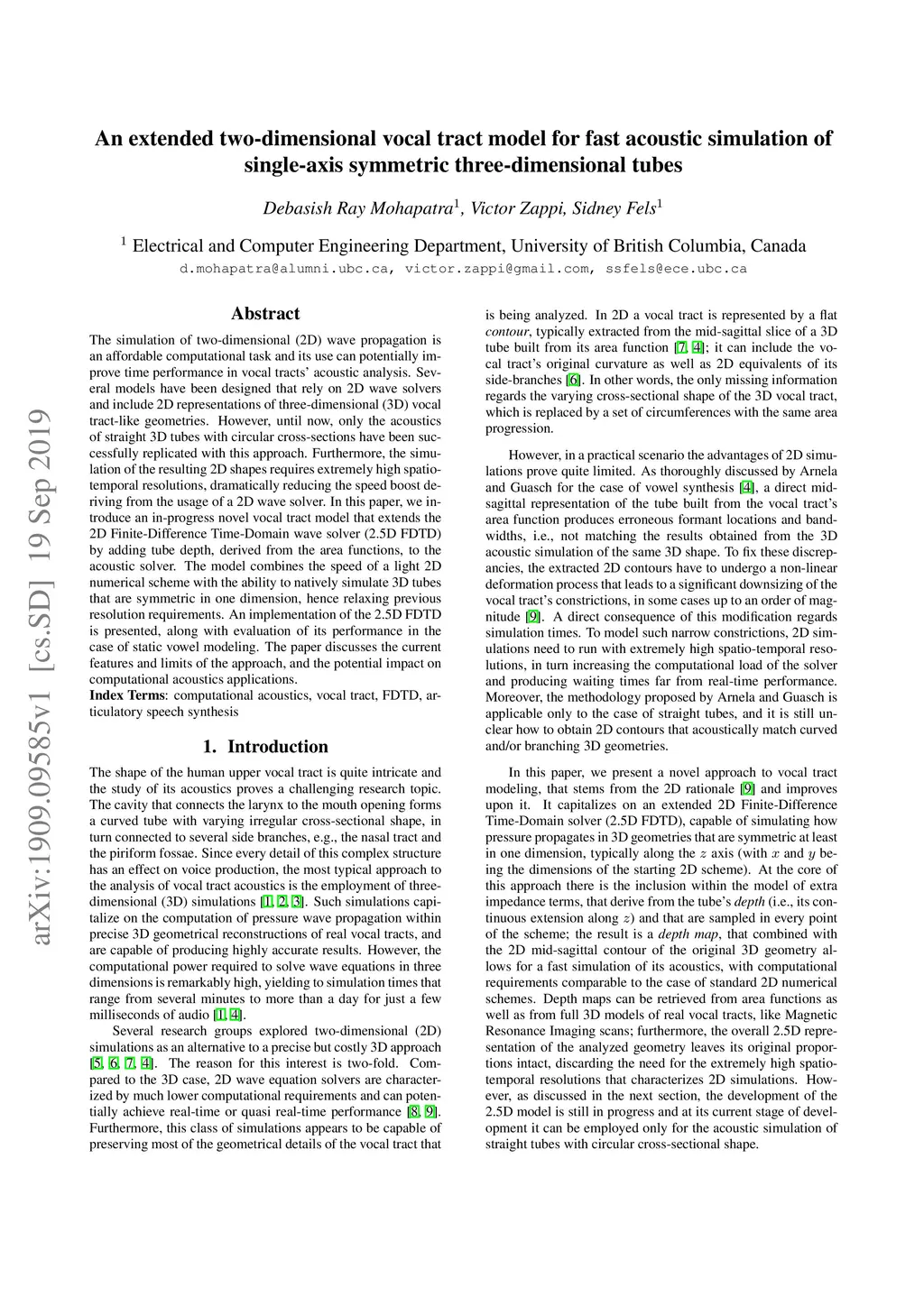 The simulation of two-dimensional (2D) wave propagation is an affordable computational task and its use can potentially improve time performance in vocal tracts' acoustic analysis. Several models have been designed that rely on 2D wave solvers and include 2D representations of three-dimensional (3D) vocal tract-like geometries. However, until now, only the acoustics of straight 3D tubes with circular cross-sections have been successfully replicated with this approach. Furthermore, the simulation of the resulting 2D shapes requires extremely high spatio-temporal resolutions, dramatically reducing the speed boost deriving from the usage of a 2D wave solver. In this paper, we introduce an in-progress novel vocal tract model that extends the 2D Finite-Difference Time-Domain wave solver (2.5D FDTD) by adding tube depth, derived from the area functions, to the acoustic solver. The model combines the speed of a light 2D numerical scheme with the ability to natively simulate 3D tubes that are symmetric in one dimension, hence relaxing previous resolution requirements. An implementation of the 2.5D FDTD is presented, along with evaluation of its performance in the case of static vowel modeling. The paper discusses the current features and limits of the approach, and the potential impact on computational acoustics applications.