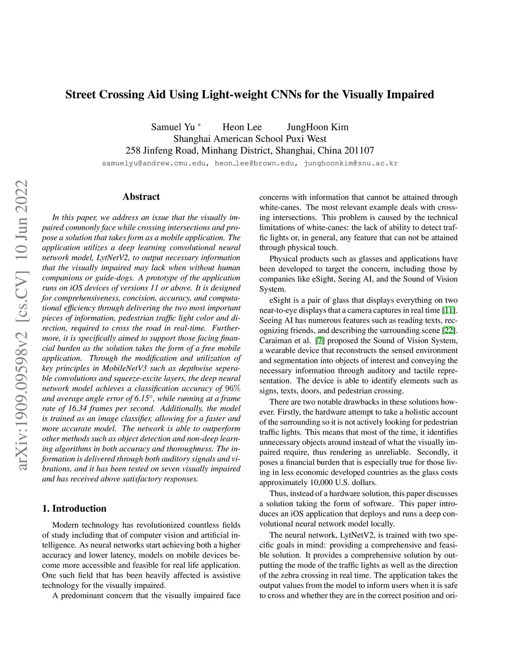 In this paper, we address an issue that the visually impaired commonly face while crossing intersections and propose a solution that takes form as a mobile application. The application utilizes a deep learning convolutional neural network model, LytNetV2, to output necessary information that the visually impaired may lack when without human companions or guide-dogs. A prototype of the application runs on iOS devices of versions 11 or above. It is designed for comprehensiveness, concision, accuracy, and computational efficiency through delivering the two most important pieces of information, pedestrian traffic light color and direction, required to cross the road in real-time. Furthermore, it is specifically aimed to support those facing financial burden as the solution takes the form of a free mobile application. Through the modification and utilization of key principles in MobileNetV3 such as depthwise seperable convolutions and squeeze-excite layers, the deep neural network model achieves a classification accuracy of 96% and average angle error of 6.15 degrees, while running at a frame rate of 16.34 frames per second. Additionally, the model is trained as an image classifier, allowing for a faster and more accurate model. The network is able to outperform other methods such as object detection and non-deep learning algorithms in both accuracy and thoroughness. The information is delivered through both auditory signals and vibrations, and it has been tested on seven visually impaired and has received above satisfactory responses.