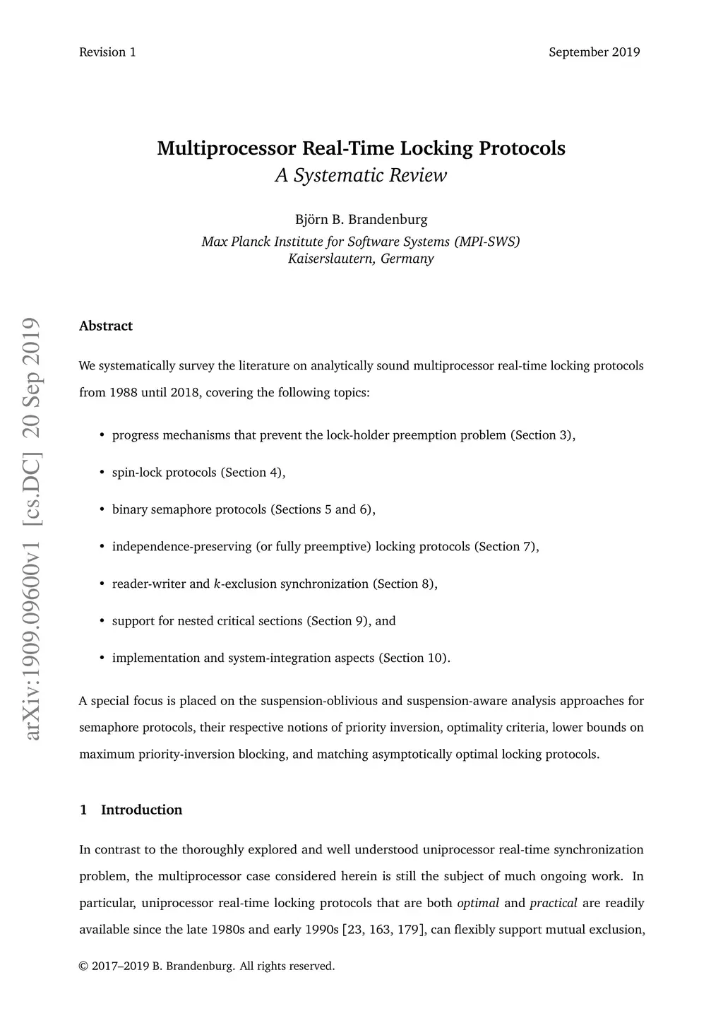 We systematically survey the literature on analytically sound multiprocessor real-time locking protocols from 1988 until 2018, covering the following topics: progress mechanisms that prevent the lock-holder preemption problem, spin-lock protocols, binary semaphore protocols, independence-preserving (or fully preemptive) locking protocols, reader-writer and k-exclusion synchronization, support for nested critical sections, and implementation and system-integration aspects. A special focus is placed on the suspension-oblivious and suspension-aware analysis approaches for semaphore protocols, their respective notions of priority inversion, optimality criteria, lower bounds on maximum priority-inversion blocking, and matching asymptotically optimal locking protocols.