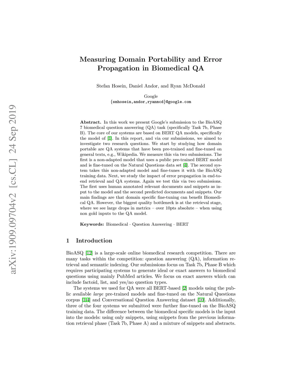 In this work we present Google's submission to the BioASQ 7 biomedical question answering (QA) task (specifically Task 7b, Phase B). The core of our systems are based on BERT QA models, specifically the model of \cite{alberti2019bert}. In this report, and via our submissions, we aimed to investigate two research questions. We start by studying how domain portable are QA systems that have been pre-trained and fine-tuned on general texts, e.g., Wikipedia. We measure this via two submissions. The first is a non-adapted model that uses a public pre-trained BERT model and is fine-tuned on the Natural Questions data set \cite{kwiatkowski2019natural}. The second system takes this non-adapted model and fine-tunes it with the BioASQ training data. Next, we study the impact of error propagation in end-to-end retrieval and QA systems. Again we test this via two submissions. The first uses human annotated relevant documents and snippets as input to the model and the second predicted documents and snippets. Our main findings are that domain specific fine-tuning can benefit Biomedical QA. However, the biggest quality bottleneck is at the retrieval stage, where we see large drops in metrics -- over 10pts absolute -- when using non gold inputs to the QA model.