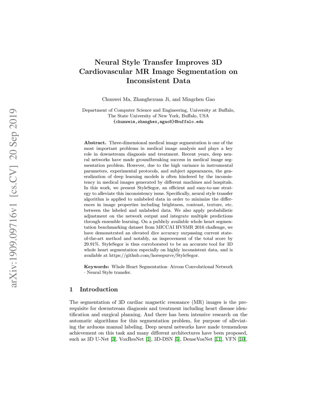 Three-dimensional medical image segmentation is one of the most important problems in medical image analysis and plays a key role in downstream diagnosis and treatment. Recent years, deep neural networks have made groundbreaking success in medical image segmentation problem. However, due to the high variance in instrumental parameters, experimental protocols, and subject appearances, the generalization of deep learning models is often hindered by the inconsistency in medical images generated by different machines and hospitals. In this work, we present StyleSegor, an efficient and easy-to-use strategy to alleviate this inconsistency issue. Specifically, neural style transfer algorithm is applied to unlabeled data in order to minimize the differences in image properties including brightness, contrast, texture, etc. between the labeled and unlabeled data. We also apply probabilistic adjustment on the network output and integrate multiple predictions through ensemble learning. On a publicly available whole heart segmentation benchmarking dataset from MICCAI HVSMR 2016 challenge, we have demonstrated an elevated dice accuracy surpassing current state-of-the-art method and notably, an improvement of the total score by 29.91\%. StyleSegor is thus corroborated to be an accurate tool for 3D whole heart segmentation especially on highly inconsistent data, and is available at https://github.com/horsepurve/StyleSegor.