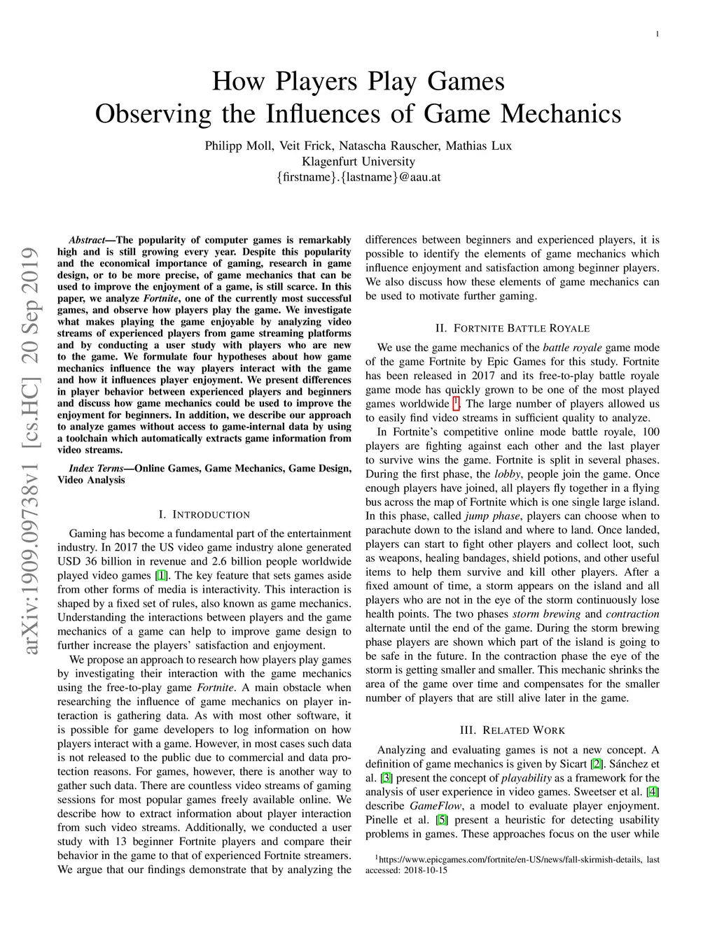 The popularity of computer games is remarkably high and is still growing every year. Despite this popularity and the economical importance of gaming, research in game design, or to be more precise, of game mechanics that can be used to improve the enjoyment of a game, is still scarce. In this paper, we analyze Fortnite, one of the currently most successful games, and observe how players play the game. We investigate what makes playing the game enjoyable by analyzing video streams of experienced players from game streaming platforms and by conducting a user study with players who are new to the game. We formulate four hypotheses about how game mechanics influence the way players interact with the game and how it influences player enjoyment. We present differences in player behavior between experienced players and beginners and discuss how game mechanics could be used to improve the enjoyment for beginners. In addition, we describe our approach to analyze games without access to game-internal data by using a toolchain which automatically extracts game information from video streams.