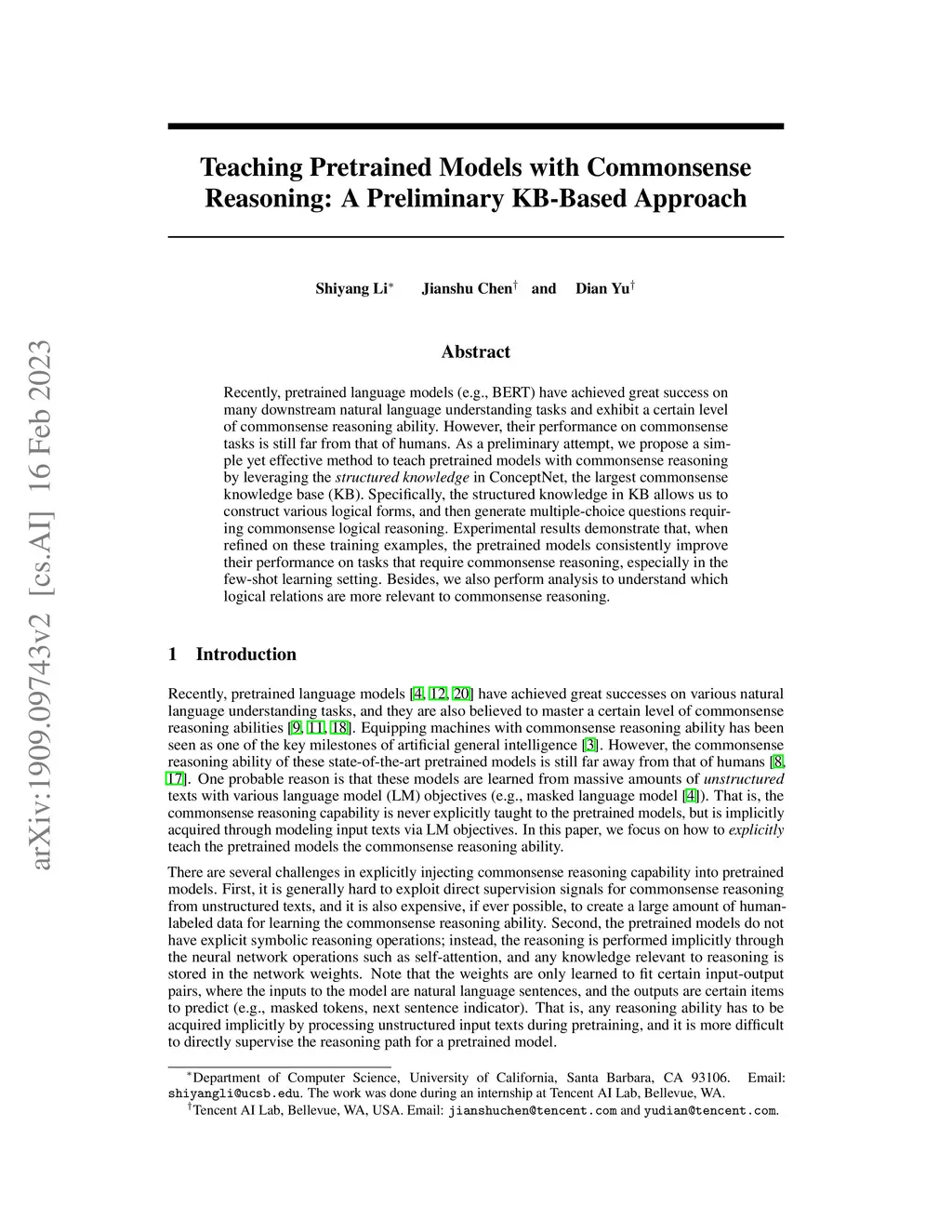 Recently, pretrained language models (e.g., BERT) have achieved great success on many downstream natural language understanding tasks and exhibit a certain level of commonsense reasoning ability. However, their performance on commonsense tasks is still far from that of humans. As a preliminary attempt, we propose a simple yet effective method to teach pretrained models with commonsense reasoning by leveraging the structured knowledge in ConceptNet, the largest commonsense knowledge base (KB). Specifically, the structured knowledge in KB allows us to construct various logical forms, and then generate multiple-choice questions requiring commonsense logical reasoning. Experimental results demonstrate that, when refined on these training examples, the pretrained models consistently improve their performance on tasks that require commonsense reasoning, especially in the few-shot learning setting. Besides, we also perform analysis to understand which logical relations are more relevant to commonsense reasoning.