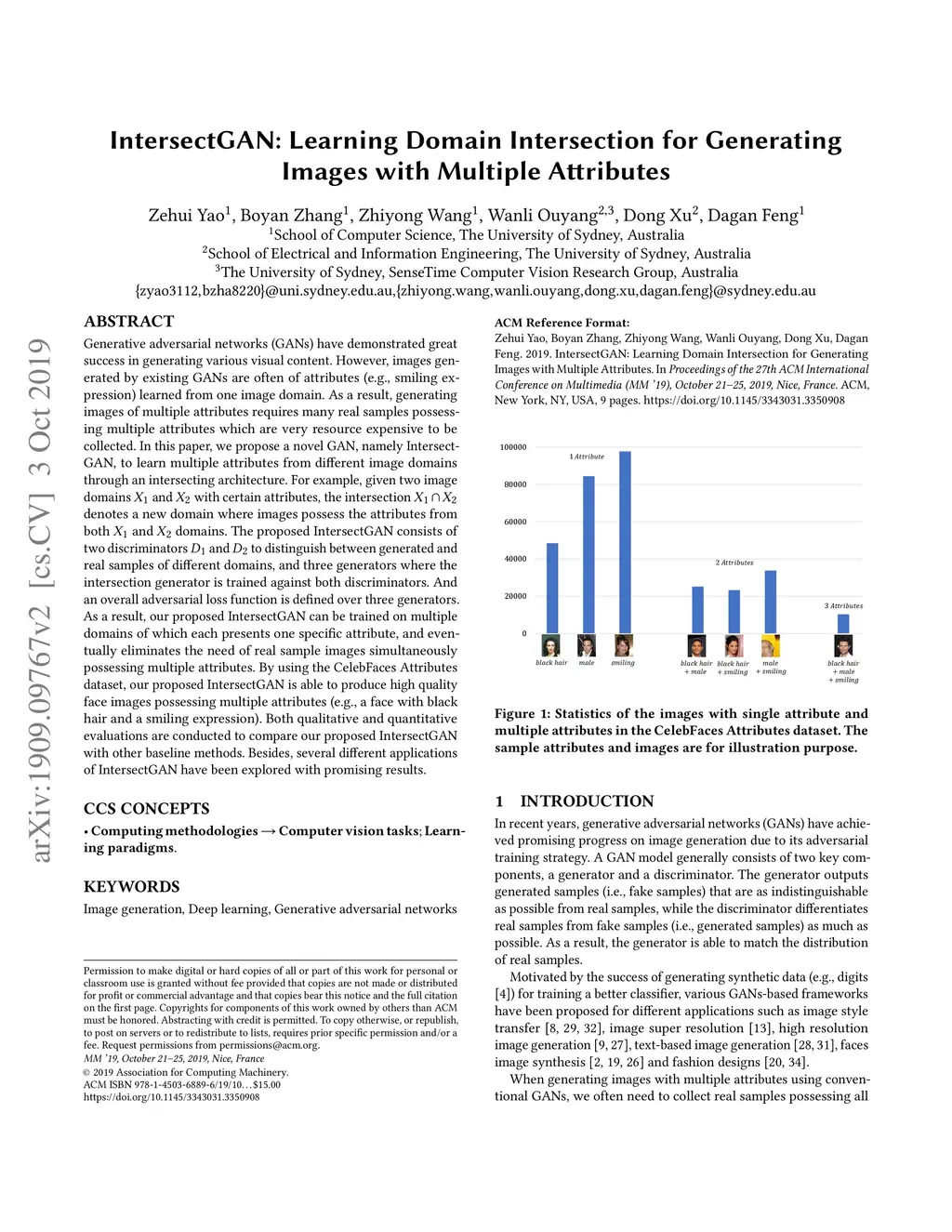 Generative adversarial networks (GANs) have demonstrated great success in generating various visual content. However, images generated by existing GANs are often of attributes (e.g., smiling expression) learned from one image domain. As a result, generating images of multiple attributes requires many real samples possessing multiple attributes which are very resource expensive to be collected. In this paper, we propose a novel GAN, namely IntersectGAN, to learn multiple attributes from different image domains through an intersecting architecture. For example, given two image domains and with certain attributes, the intersection denotes a new domain where images possess the attributes from both and domains. The proposed IntersectGAN consists of two discriminators and to distinguish between generated and real samples of different domains, and three generators where the intersection generator is trained against both discriminators. And an overall adversarial loss function is defined over three generators. As a result, our proposed IntersectGAN can be trained on multiple domains of which each presents one specific attribute, and eventually eliminates the need of real sample images simultaneously possessing multiple attributes. By using the CelebFaces Attributes dataset, our proposed IntersectGAN is able to produce high quality face images possessing multiple attributes (e.g., a face with black hair and a smiling expression). Both qualitative and quantitative evaluations are conducted to compare our proposed IntersectGAN with other baseline methods. Besides, several different applications of IntersectGAN have been explored with promising results.