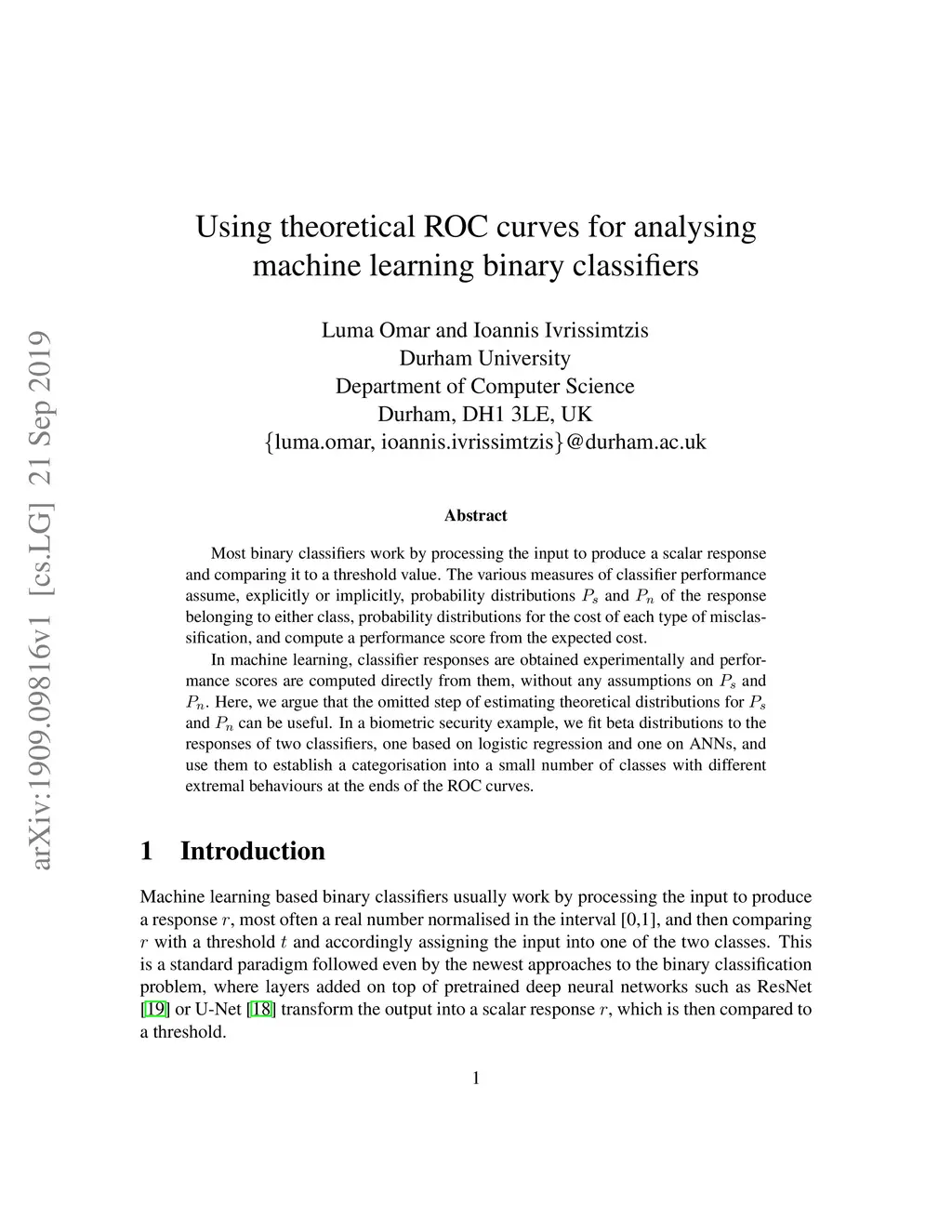 Most binary classifiers work by processing the input to produce a scalar response and comparing it to a threshold value. The various measures of classifier performance assume, explicitly or implicitly, probability distributions and of the response belonging to either class, probability distributions for the cost of each type of misclassification, and compute a performance score from the expected cost. In machine learning, classifier responses are obtained experimentally and performance scores are computed directly from them, without any assumptions on and . Here, we argue that the omitted step of estimating theoretical distributions for and can be useful. In a biometric security example, we fit beta distributions to the responses of two classifiers, one based on logistic regression and one on ANNs, and use them to establish a categorisation into a small number of classes with different extremal behaviours at the ends of the ROC curves.