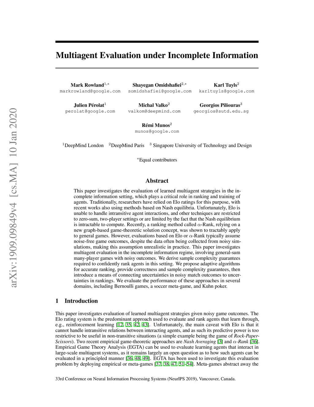 This paper investigates the evaluation of learned multiagent strategies in the incomplete information setting, which plays a critical role in ranking and training of agents. Traditionally, researchers have relied on Elo ratings for this purpose, with recent works also using methods based on Nash equilibria. Unfortunately, Elo is unable to handle intransitive agent interactions, and other techniques are restricted to zero-sum, two-player settings or are limited by the fact that the Nash equilibrium is intractable to compute. Recently, a ranking method called {\alpha}-Rank, relying on a new graph-based game-theoretic solution concept, was shown to tractably apply to general games. However, evaluations based on Elo or {\alpha}-Rank typically assume noise-free game outcomes, despite the data often being collected from noisy simulations, making this assumption unrealistic in practice. This paper investigates multiagent evaluation in the incomplete information regime, involving general-sum many-player games with noisy outcomes. We derive sample complexity guarantees required to confidently rank agents in this setting. We propose adaptive algorithms for accurate ranking, provide correctness and sample complexity guarantees, then introduce a means of connecting uncertainties in noisy match outcomes to uncertainties in rankings. We evaluate the performance of these approaches in several domains, including Bernoulli games, a soccer meta-game, and Kuhn poker.