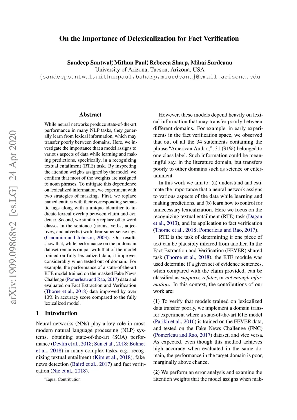 In this work we aim to understand and estimate the importance that a neural network assigns to various aspects of the data while learning and making predictions. Here we focus on the recognizing textual entailment (RTE) task and its application to fact verification. In this context, the contributions of this work are as follows. We investigate the attention weights a state of the art RTE method assigns to input tokens in the RTE component of fact verification systems, and confirm that most of the weight is assigned to POS tags of nouns (e.g., NN, NNP etc.) or their phrases. To verify that these lexicalized models transfer poorly, we implement a domain transfer experiment where a RTE component is trained on the FEVER data, and tested on the Fake News Challenge (FNC) dataset. As expected, even though this method achieves high accuracy when evaluated in the same domain, the performance in the target domain is poor, marginally above chance.To mitigate this dependence on lexicalized information, we experiment with several strategies for masking out names by replacing them with their semantic category, coupled with a unique identifier to mark that the same or new entities are referenced between claim and evidence. The results show that, while the performance on the FEVER dataset remains at par with that of the model trained on lexicalized data, it improves significantly when tested in the FNC dataset. Thus our experiments demonstrate that our strategy is successful in mitigating the dependency on lexical information.