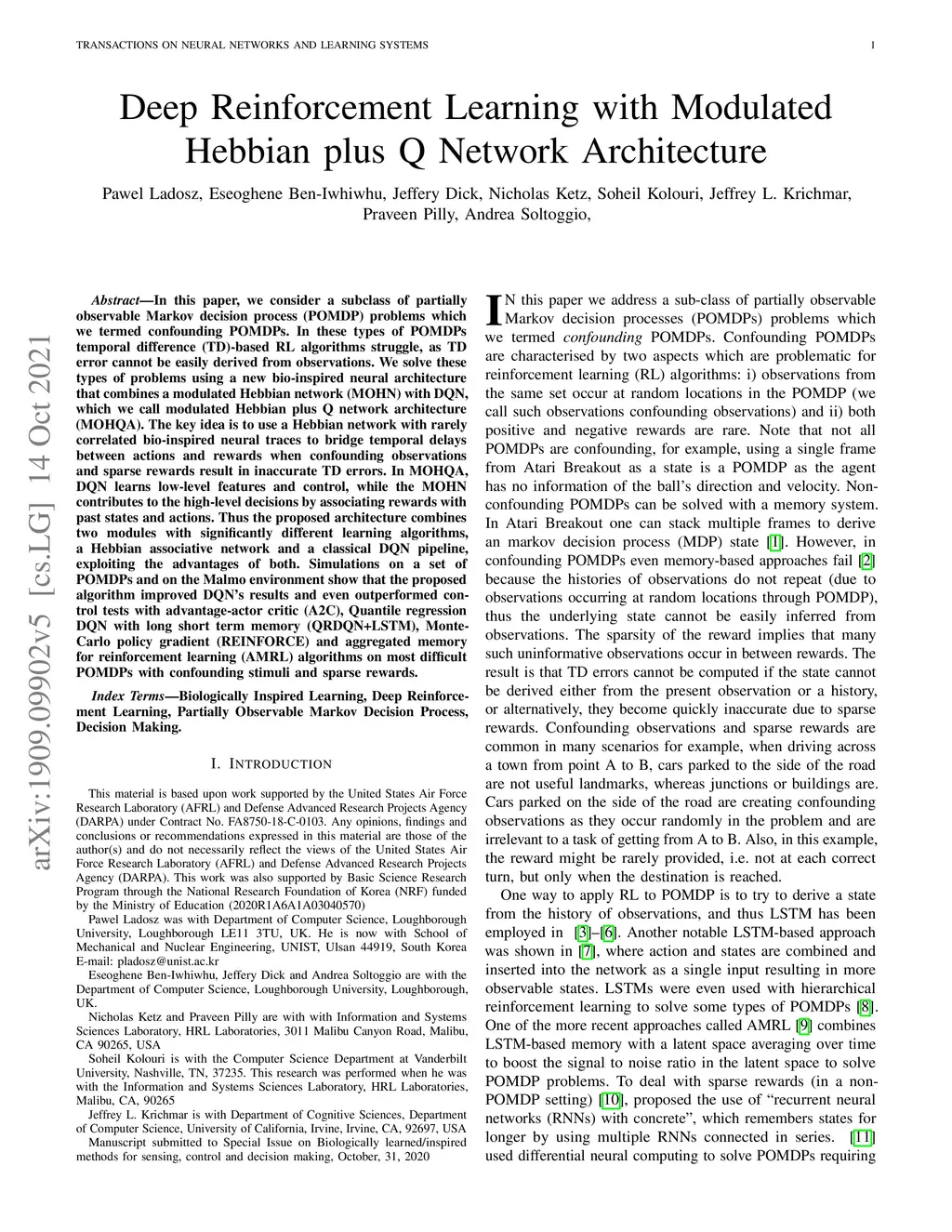 This paper presents a new neural architecture that combines a modulated Hebbian network (MOHN) with DQN, which we call modulated Hebbian plus Q network architecture (MOHQA). The hypothesis is that such a combination allows MOHQA to solve difficult partially observable Markov decision process (POMDP) problems which impair temporal difference (TD)-based RL algorithms such as DQN, as the TD error cannot be easily derived from observations. The key idea is to use a Hebbian network with bio-inspired neural traces in order to bridge temporal delays between actions and rewards when confounding observations and sparse rewards result in inaccurate TD errors. In MOHQA, DQN learns low level features and control, while the MOHN contributes to the high-level decisions by associating rewards with past states and actions. Thus the proposed architecture combines two modules with significantly different learning algorithms, a Hebbian associative network and a classical DQN pipeline, exploiting the advantages of both. Simulations on a set of POMDPs and on the MALMO environment show that the proposed algorithm improved DQN's results and even outperformed control tests with A2C, QRDQN+LSTM and REINFORCE algorithms on some POMDPs with confounding stimuli and sparse rewards.