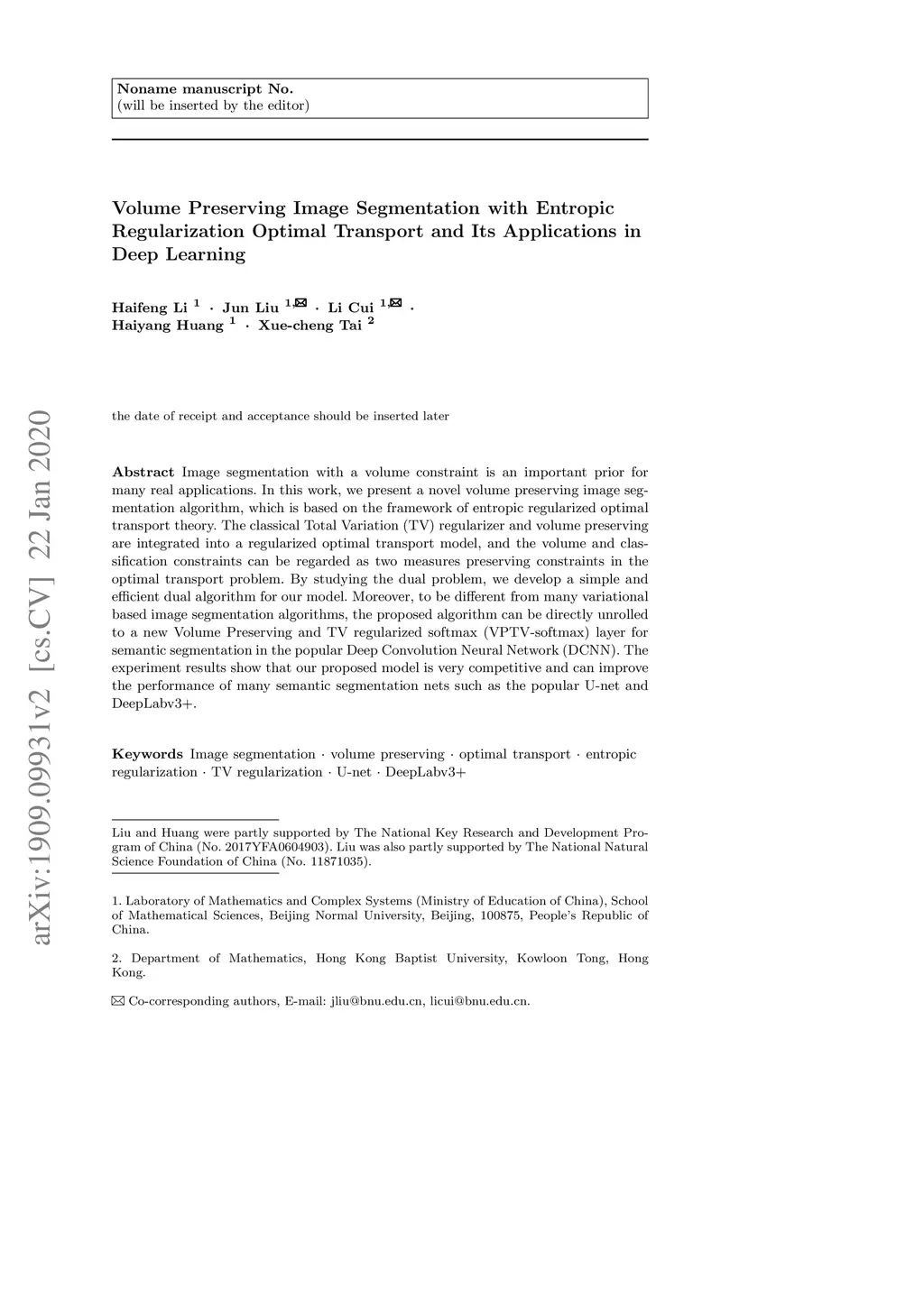 Image segmentation with a volume constraint is an important prior for many real applications. In this work, we present a novel volume preserving image segmentation algorithm, which is based on the framework of entropic regularized optimal transport theory. The classical Total Variation (TV) regularizer and volume preserving are integrated into a regularized optimal transport model, and the volume and classification constraints can be regarded as two measures preserving constraints in the optimal transport problem. By studying the dual problem, we develop a simple and efficient dual algorithm for our model. Moreover, to be different from many variational based image segmentation algorithms, the proposed algorithm can be directly unrolled to a new Volume Preserving and TV regularized softmax (VPTV-softmax) layer for semantic segmentation in the popular Deep Convolution Neural Network (DCNN). The experiment results show that our proposed model is very competitive and can improve the performance of many semantic segmentation nets such as the popular U-net.