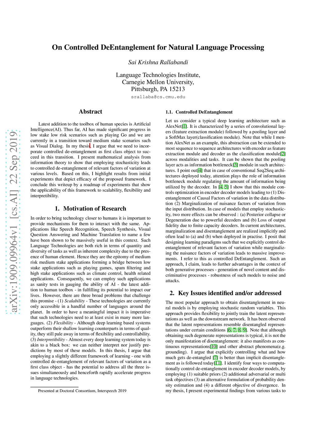 Latest addition to the toolbox of human species is Artificial Intelligence(AI). Thus far, AI has made significant progress in low stake low risk scenarios such as playing Go and we are currently in a transition toward medium stake scenarios such as Visual Dialog. In my thesis, I argue that we need to incorporate controlled de-entanglement as first class object to succeed in this transition. I present mathematical analysis from information theory to show that employing stochasticity leads to controlled de-entanglement of relevant factors of variation at various levels. Based on this, I highlight results from initial experiments that depict efficacy of the proposed framework. I conclude this writeup by a roadmap of experiments that show the applicability of this framework to scalability, flexibility and interpretibility.