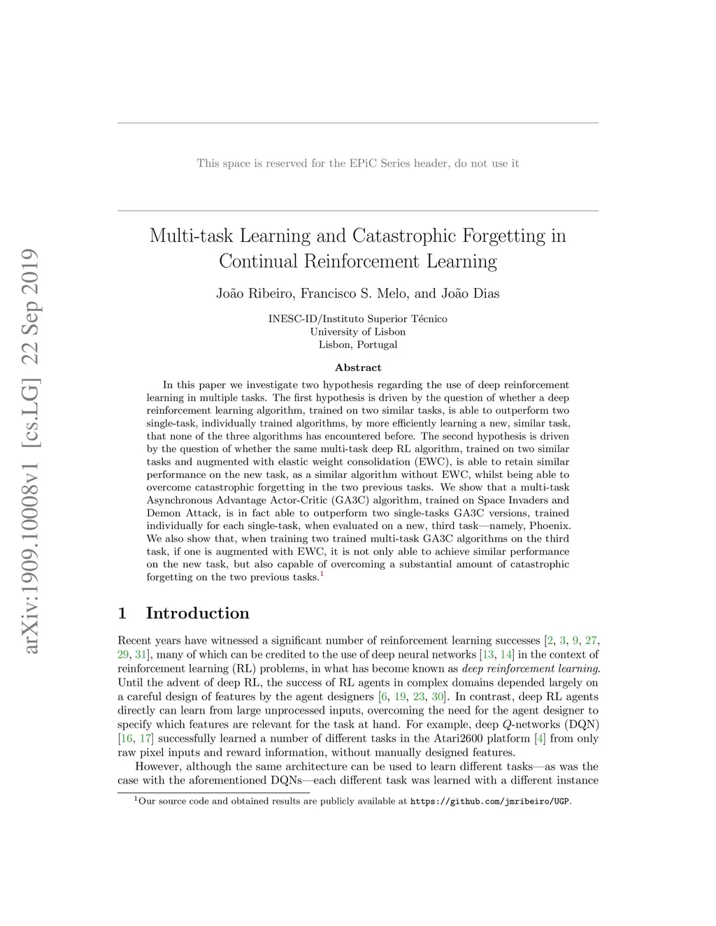 In this paper we investigate two hypothesis regarding the use of deep reinforcement learning in multiple tasks. The first hypothesis is driven by the question of whether a deep reinforcement learning algorithm, trained on two similar tasks, is able to outperform two single-task, individually trained algorithms, by more efficiently learning a new, similar task, that none of the three algorithms has encountered before. The second hypothesis is driven by the question of whether the same multi-task deep RL algorithm, trained on two similar tasks and augmented with elastic weight consolidation (EWC), is able to retain similar performance on the new task, as a similar algorithm without EWC, whilst being able to overcome catastrophic forgetting in the two previous tasks. We show that a multi-task Asynchronous Advantage Actor-Critic (GA3C) algorithm, trained on Space Invaders and Demon Attack, is in fact able to outperform two single-tasks GA3C versions, trained individually for each single-task, when evaluated on a new, third task, namely, Phoenix. We also show that, when training two trained multi-task GA3C algorithms on the third task, if one is augmented with EWC, it is not only able to achieve similar performance on the new task, but also capable of overcoming a substantial amount of catastrophic forgetting on the two previous tasks.