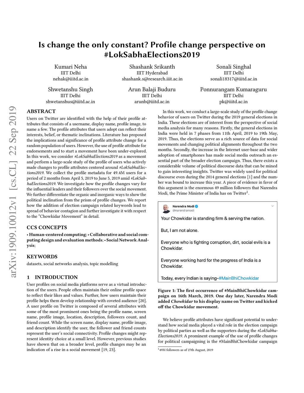 Users on Twitter are identified with the help of their profile attributes that consists of username, display name, profile image, to name a few. The profile attributes that users adopt can reflect their interests, belief, or thematic inclinations. Literature has proposed the implications and significance of profile attribute change for a random population of users. However, the use of profile attribute for endorsements and to start a movement have been under-explored. In this work, we consider #LokSabhaElections2019 as a movement and perform a large-scale study of the profile of users who actively made changes to profile attributes centered around #LokSabhaElections2019. We collect the profile metadata for 49.4M users for a period of 2 months from April 5, 2019 to June 5, 2019 amid #LokSabhaElections2019. We investigate how the profile changes vary for the influential leaders and their followers over the social movement. We further differentiate the organic and inorganic ways to show the political inclination from the prism of profile changes. We report how the addition of election campaign related keywords lead to spread of behavior contagion and further investigate it with respect to "Chowkidar Movement" in detail.