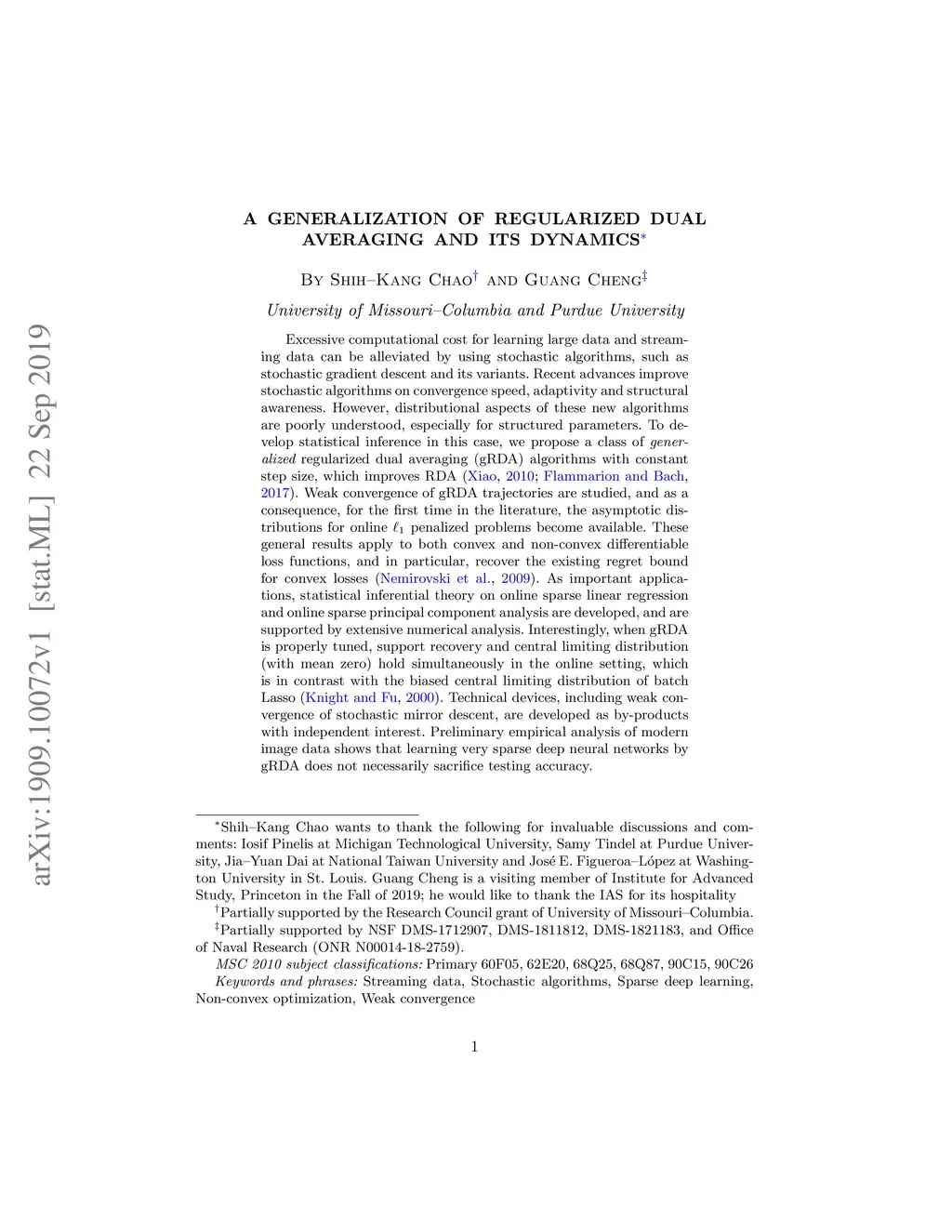 Excessive computational cost for learning large data and streaming data can be alleviated by using stochastic algorithms, such as stochastic gradient descent and its variants. Recent advances improve stochastic algorithms on convergence speed, adaptivity and structural awareness. However, distributional aspects of these new algorithms are poorly understood, especially for structured parameters. To develop statistical inference in this case, we propose a class of generalized regularized dual averaging (gRDA) algorithms with constant step size, which improves RDA (Xiao, 2010; Flammarion and Bach, 2017). Weak convergence of gRDA trajectories are studied, and as a consequence, for the first time in the literature, the asymptotic distributions for online l1 penalized problems become available. These general results apply to both convex and non-convex differentiable loss functions, and in particular, recover the existing regret bound for convex losses (Nemirovski et al., 2009). As important applications, statistical inferential theory on online sparse linear regression and online sparse principal component analysis are developed, and are supported by extensive numerical analysis. Interestingly, when gRDA is properly tuned, support recovery and central limiting distribution (with mean zero) hold simultaneously in the online setting, which is in contrast with the biased central limiting distribution of batch Lasso (Knight and Fu, 2000). Technical devices, including weak convergence of stochastic mirror descent, are developed as by-products with independent interest. Preliminary empirical analysis of modern image data shows that learning very sparse deep neural networks by gRDA does not necessarily sacrifice testing accuracy.