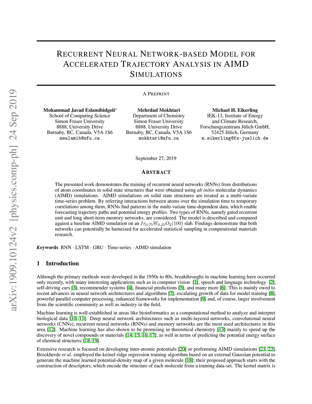 The presented work demonstrates the training of recurrent neural networks (RNNs) from distributions of atom coordinates in solid state structures that were obtained using ab initio molecular dynamics (AIMD) simulations. AIMD simulations on solid state structures are treated as a multi-variate time-series problem. By referring interactions between atoms over the simulation time to temporary correlations among them, RNNs find patterns in the multi-variate time-dependent data, which enable forecasting trajectory paths and potential energy profiles. Two types of RNNs, namely gated recurrent unit and long short-term memory networks, are considered. The model is described and compared against a baseline AIMD simulation on an iridium oxide slab. Findings demonstrate that both networks can potentially be harnessed for accelerated statistical sampling in computational materials research.