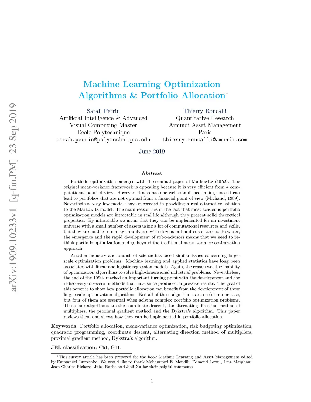 Portfolio optimization emerged with the seminal paper of Markowitz (1952). The original mean-variance framework is appealing because it is very efficient from a computational point of view. However, it also has one well-established failing since it can lead to portfolios that are not optimal from a financial point of view. Nevertheless, very few models have succeeded in providing a real alternative solution to the Markowitz model. The main reason lies in the fact that most academic portfolio optimization models are intractable in real life although they present solid theoretical properties. By intractable we mean that they can be implemented for an investment universe with a small number of assets using a lot of computational resources and skills, but they are unable to manage a universe with dozens or hundreds of assets. However, the emergence and the rapid development of robo-advisors means that we need to rethink portfolio optimization and go beyond the traditional mean-variance optimization approach. Another industry has faced similar issues concerning large-scale optimization problems. Machine learning has long been associated with linear and logistic regression models. Again, the reason was the inability of optimization algorithms to solve high-dimensional industrial problems. Nevertheless, the end of the 1990s marked an important turning point with the development and the rediscovery of several methods that have since produced impressive results. The goal of this paper is to show how portfolio allocation can benefit from the development of these large-scale optimization algorithms. Not all of these algorithms are useful in our case, but four of them are essential when solving complex portfolio optimization problems. These four algorithms are the coordinate descent, the alternating direction method of multipliers, the proximal gradient method and the Dykstra's algorithm.