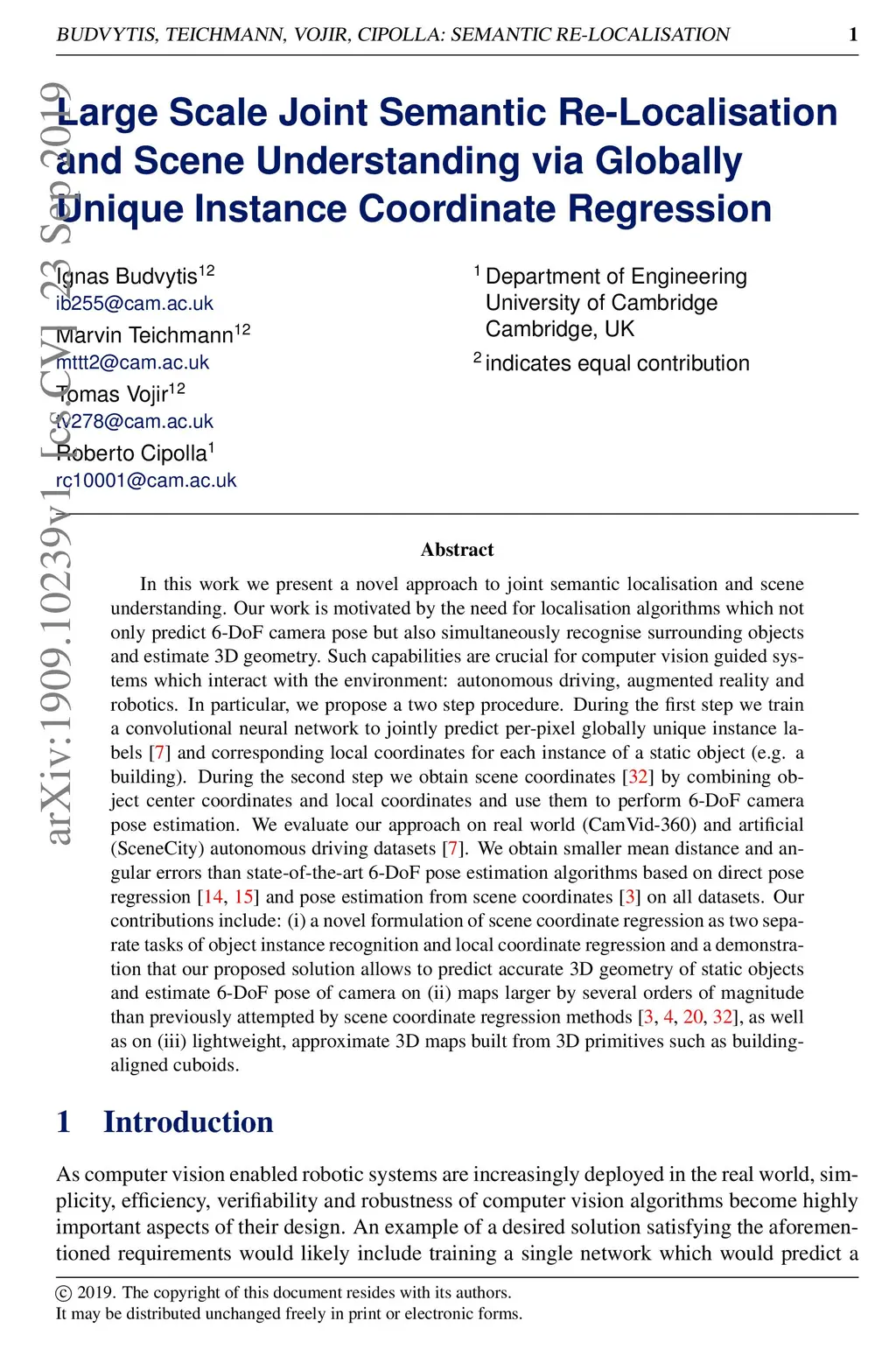 In this work we present a novel approach to joint semantic localisation and scene understanding. Our work is motivated by the need for localisation algorithms which not only predict 6-DoF camera pose but also simultaneously recognise surrounding objects and estimate 3D geometry. Such capabilities are crucial for computer vision guided systems which interact with the environment: autonomous driving, augmented reality and robotics. In particular, we propose a two step procedure. During the first step we train a convolutional neural network to jointly predict per-pixel globally unique instance labels and corresponding local coordinates for each instance of a static object (e.g. a building). During the second step we obtain scene coordinates by combining object center coordinates and local coordinates and use them to perform 6-DoF camera pose estimation. We evaluate our approach on real world (CamVid-360) and artificial (SceneCity) autonomous driving datasets. We obtain smaller mean distance and angular errors than state-of-the-art 6-DoF pose estimation algorithms based on direct pose regression and pose estimation from scene coordinates on all datasets. Our contributions include: (i) a novel formulation of scene coordinate regression as two separate tasks of object instance recognition and local coordinate regression and a demonstration that our proposed solution allows to predict accurate 3D geometry of static objects and estimate 6-DoF pose of camera on (ii) maps larger by several orders of magnitude than previously attempted by scene coordinate regression methods, as well as on (iii) lightweight, approximate 3D maps built from 3D primitives such as building-aligned cuboids.