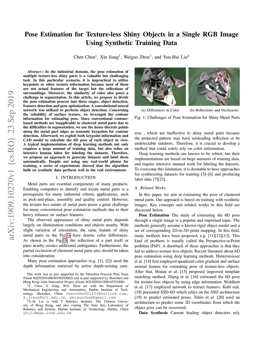 In the industrial domain, the pose estimation of multiple texture-less shiny parts is a valuable but challenging task. In this particular scenario, it is impractical to utilize keypoints or other texture information because most of them are not actual features of the target but the reflections of surroundings. Moreover, the similarity of color also poses a challenge in segmentation. In this article, we propose to divide the pose estimation process into three stages: object detection, features detection and pose optimization. A convolutional neural network was utilized to perform object detection. Concerning the reliability of surface texture, we leveraged the contour information for estimating pose. Since conventional contour-based methods are inapplicable to clustered metal parts due to the difficulties in segmentation, we use the dense discrete points along the metal part edges as semantic keypoints for contour detection. Afterward, we exploit both keypoint information and CAD model to calculate the 6D pose of each object in view. A typical implementation of deep learning methods not only requires a large amount of training data, but also relies on intensive human labor for labeling the datasets. Therefore, we propose an approach to generate datasets and label them automatically. Despite not using any real-world photos for training, a series of experiments showed that the algorithm built on synthetic data perform well in the real environment.
