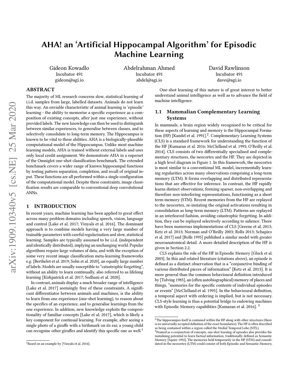 The majority of ML research concerns slow, statistical learning of i.i.d. samples from large, labelled datasets. Animals do not learn this way. An enviable characteristic of animal learning is `episodic' learning - the ability to memorise a specific experience as a composition of existing concepts, after just one experience, without provided labels. The new knowledge can then be used to distinguish between similar experiences, to generalise between classes, and to selectively consolidate to long-term memory. The Hippocampus is known to be vital to these abilities. AHA is a biologically-plausible computational model of the Hippocampus. Unlike most machine learning models, AHA is trained without external labels and uses only local credit assignment. We demonstrate AHA in a superset of the Omniglot one-shot classification benchmark. The extended benchmark covers a wider range of known hippocampal functions by testing pattern separation, completion, and recall of original input. These functions are all performed within a single configuration of the computational model. Despite these constraints, image classification results are comparable to conventional deep convolutional ANNs.