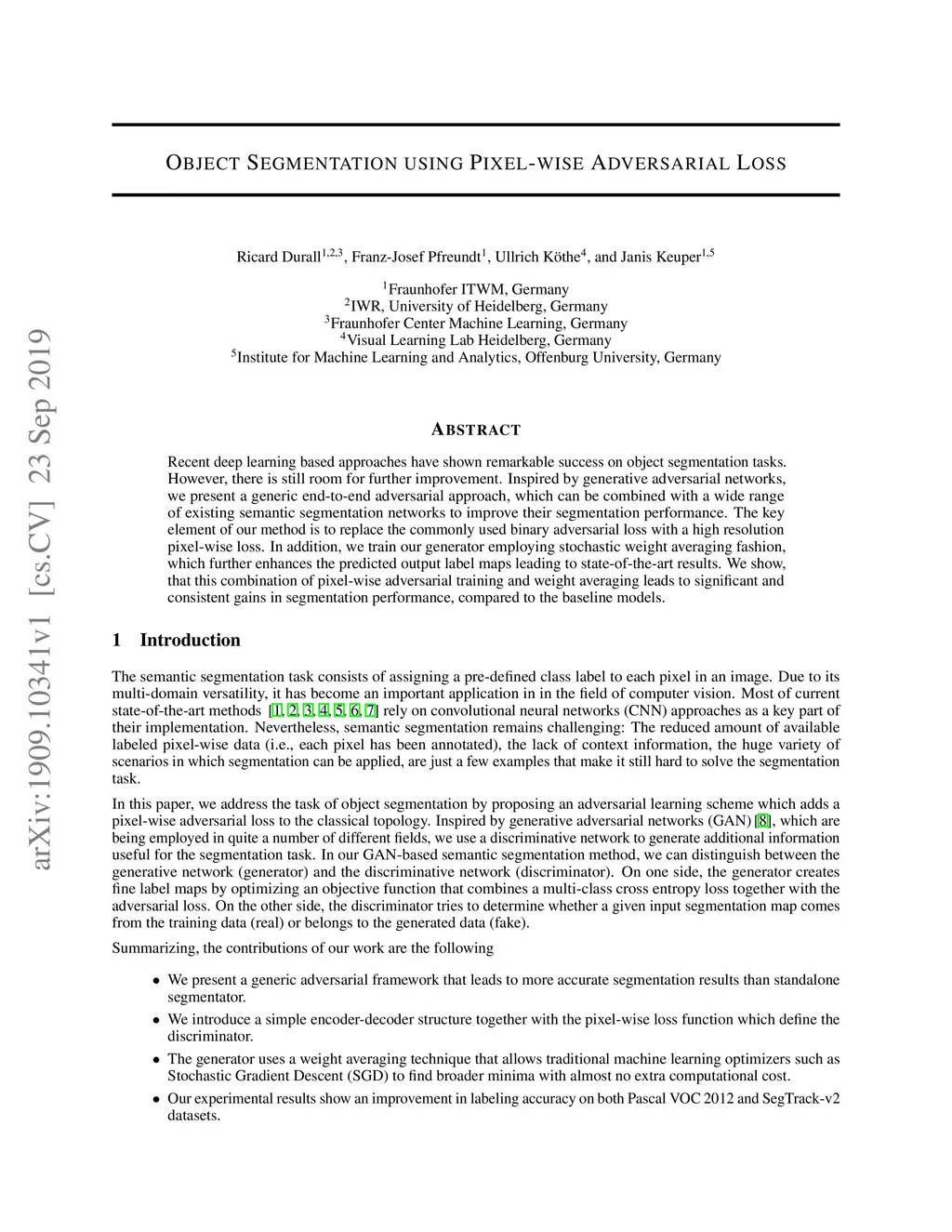 Object Segmentation using Pixel-wise Adversarial Loss