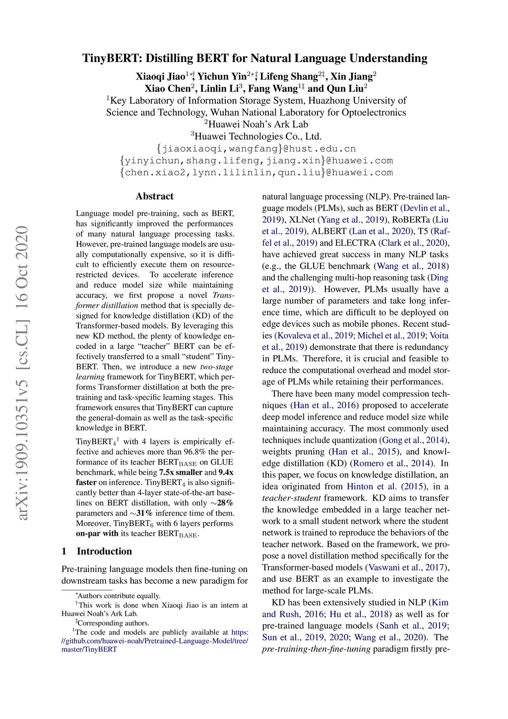 Language model pre-training, such as BERT, has significantly improved the performances of many natural language processing tasks. However, pre-trained language models are usually computationally expensive, so it is difficult to efficiently execute them on resource-restricted devices. To accelerate inference and reduce model size while maintaining accuracy, we first propose a novel Transformer distillation method that is specially designed for knowledge distillation (KD) of the Transformer-based models. By leveraging this new KD method, the plenty of knowledge encoded in a large teacher BERT can be effectively transferred to a small student Tiny-BERT. Then, we introduce a new two-stage learning framework for TinyBERT, which performs Transformer distillation at both the pretraining and task-specific learning stages. This framework ensures that TinyBERT can capture he general-domain as well as the task-specific knowledge in BERT. TinyBERT with 4 layers is empirically effective and achieves more than 96.8% the performance of its teacher BERTBASE on GLUE benchmark, while being 7.5x smaller and 9.4x faster on inference. TinyBERT with 4 layers is also significantly better than 4-layer state-of-the-art baselines on BERT distillation, with only about 28% parameters and about 31% inference time of them. Moreover, TinyBERT with 6 layers performs on-par with its teacher BERTBASE.