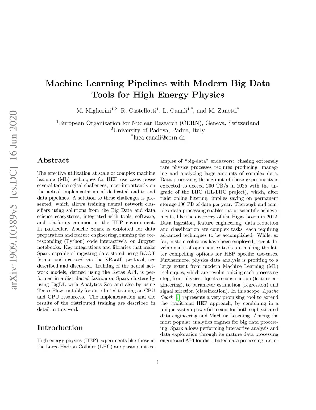 Machine Learning Pipelines with Modern Big Data Tools for High Energy