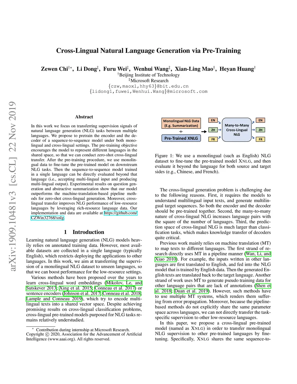 Cross-Lingual Natural Language Generation via Pre-Training