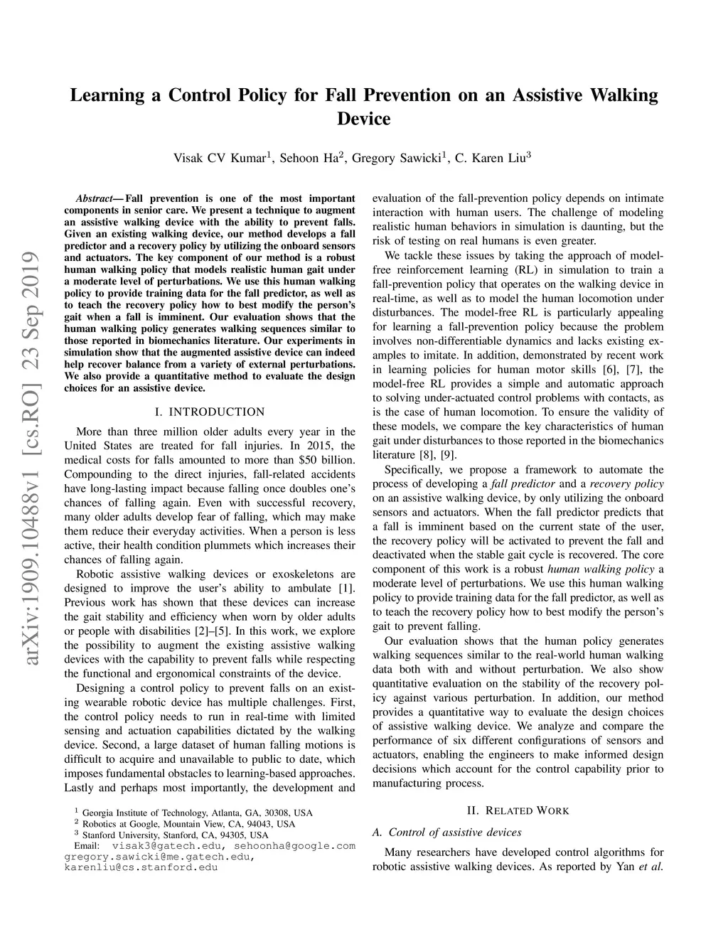 Learning a Control Policy for Fall Prevention on an Assistive Walking