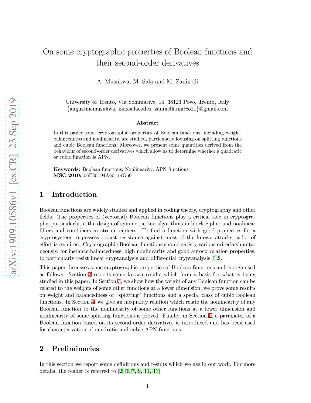 In this paper some cryptographic properties of Boolean functions, including weight, balancedness and nonlinearity, are studied, particularly focusing on splitting functions and cubic Boolean functions. Moreover, we present some quantities derived from the behaviour of second-order derivatives which allow us to determine whether a quadratic or cubic function is APN.