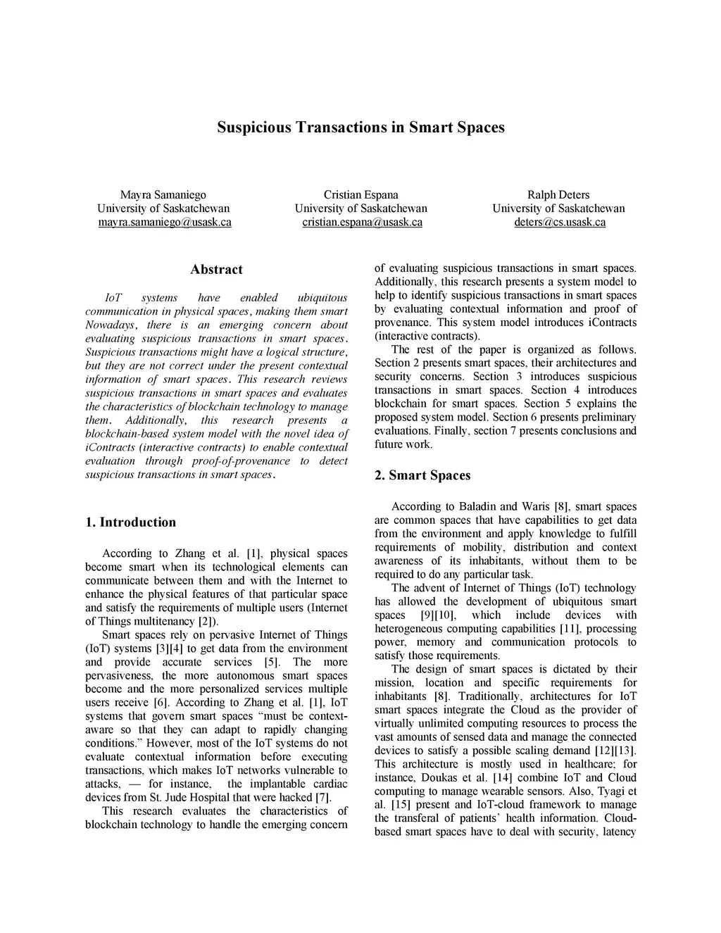 IoT systems have enabled ubiquitous communication in physical spaces, making them smart Nowadays, there is an emerging concern about evaluating suspicious transactions in smart spaces. Suspicious transactions might have a logical structure, but they are not correct under the present contextual information of smart spaces. This research reviews suspicious transactions in smart spaces and evaluates the characteristics of blockchain technology to manage them. Additionally, this research presents a blockchain-based system model with the novel idea of iContracts (interactive contracts) to enable contextual evaluation through proof-of-provenance to detect suspicious transactions in smart spaces.