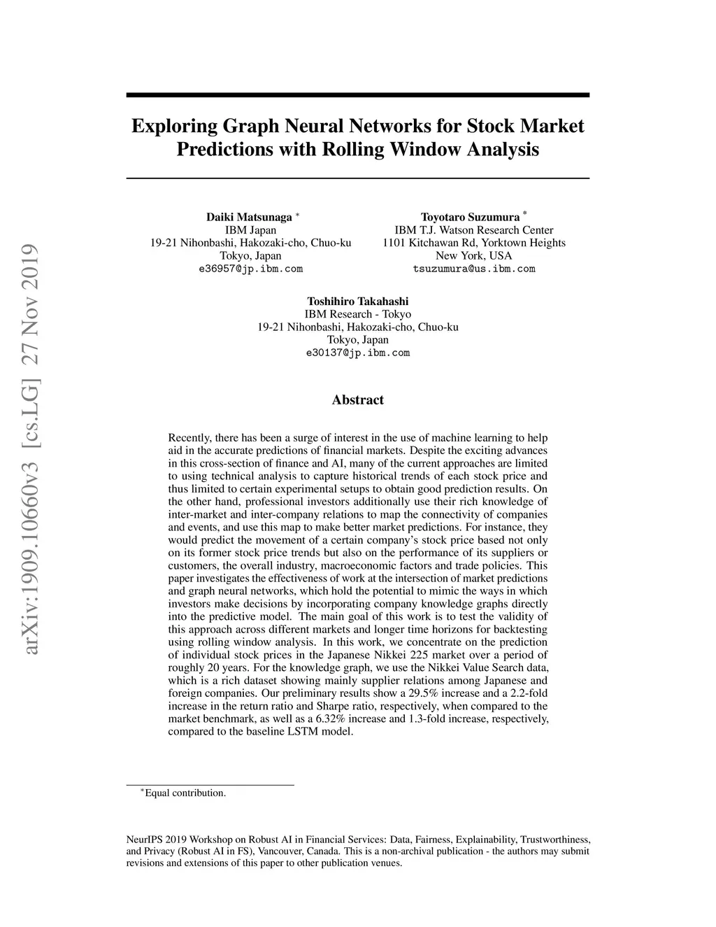 Recently, there has been a surge of interest in the use of machine learning to help aid in the accurate predictions of financial markets. Despite the exciting advances in this cross-section of finance and AI, many of the current approaches are limited to using technical analysis to capture historical trends of each stock price and thus limited to certain experimental setups to obtain good prediction results. On the other hand, professional investors additionally use their rich knowledge of inter-market and inter-company relations to map the connectivity of companies and events, and use this map to make better market predictions. For instance, they would predict the movement of a certain company's stock price based not only on its former stock price trends but also on the performance of its suppliers or customers, the overall industry, macroeconomic factors and trade policies. This paper investigates the effectiveness of work at the intersection of market predictions and graph neural networks, which hold the potential to mimic the ways in which investors make decisions by incorporating company knowledge graphs directly into the predictive model. The main goal of this work is to test the validity of this approach across different markets and longer time horizons for backtesting using rolling window analysis. In this work, we concentrate on the prediction of individual stock prices in the Japanese Nikkei 225 market over a period of roughly 20 years. For the knowledge graph, we use the Nikkei Value Search data, which is a rich dataset showing mainly supplier relations among Japanese and foreign companies. Our preliminary results show a 29.5% increase and a 2.2-fold increase in the return ratio and Sharpe ratio, respectively, when compared to the market benchmark, as well as a 6.32% increase and 1.3-fold increase, respectively, compared to the baseline LSTM model.
