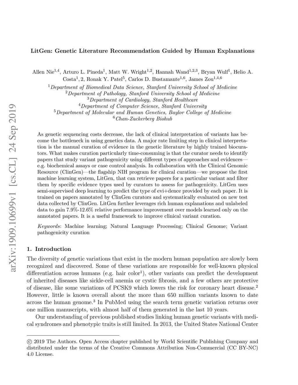 As genetic sequencing costs decrease, the lack of clinical interpretation of variants has become the bottleneck in using genetics data. A major rate limiting step in clinical interpretation is the manual curation of evidence in the genetic literature by highly trained biocurators. What makes curation particularly time-consuming is that the curator needs to identify papers that study variant pathogenicity using different types of approaches and evidences---e.g. biochemical assays or case control analysis. In collaboration with the Clinical Genomic Resource (ClinGen)---the flagship NIH program for clinical curation---we propose the first machine learning system, LitGen, that can retrieve papers for a particular variant and filter them by specific evidence types used by curators to assess for pathogenicity. LitGen uses semi-supervised deep learning to predict the type of evidence provided by each paper. It is trained on papers annotated by ClinGen curators and systematically evaluated on new test data collected by ClinGen. LitGen further leverages rich human explanations and unlabeled data to gain 7.9%-12.6% relative performance improvement over models learned only on the annotated papers. It is a useful framework to improve clinical variant curation.