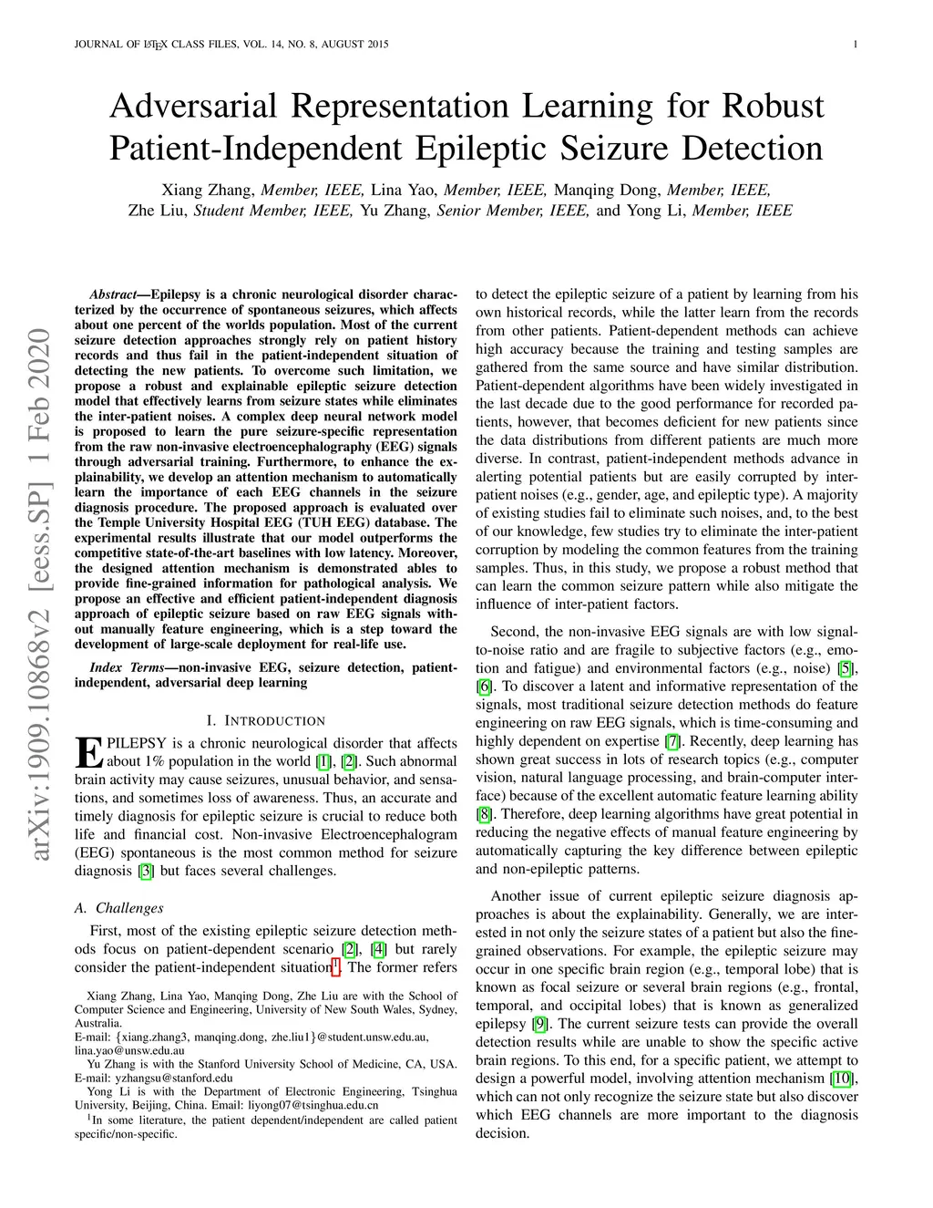 Objective: Epilepsy is a chronic neurological disorder characterized by the occurrence of spontaneous seizures, which affects about one percent of the world's population. Most of the current seizure detection approaches strongly rely on patient history records and thus fail in the patient-independent situation of detecting the new patients. To overcome such limitation, we propose a robust and explainable epileptic seizure detection model that effectively learns from seizure states while eliminates the inter-patient noises. Methods: A complex deep neural network model is proposed to learn the pure seizure-specific representation from the raw non-invasive electroencephalography (EEG) signals through adversarial training. Furthermore, to enhance the explainability, we develop an attention mechanism to automatically learn the importance of each EEG channels in the seizure diagnosis procedure. Results: The proposed approach is evaluated over the Temple University Hospital EEG (TUH EEG) database. The experimental results illustrate that our model outperforms the competitive state-of-the-art baselines with low latency. Moreover, the designed attention mechanism is demonstrated ables to provide fine-grained information for pathological analysis. Conclusion and significance: We propose an effective and efficient patient-independent diagnosis approach of epileptic seizure based on raw EEG signals without manually feature engineering, which is a step toward the development of large-scale deployment for real-life use.
