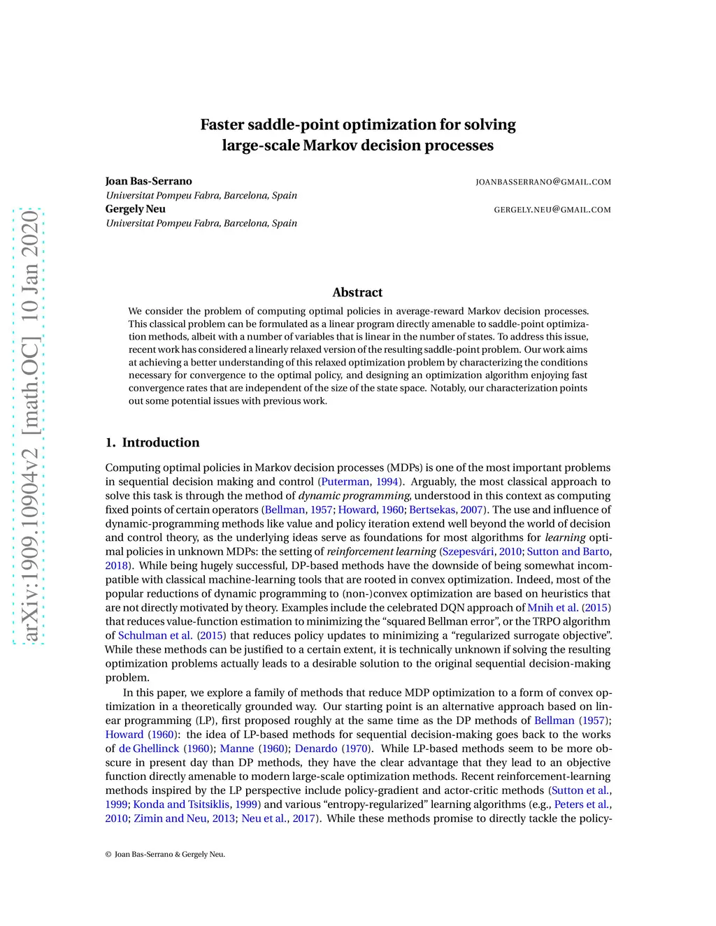 We consider the problem of computing optimal policies in average-reward Markov decision processes. This classical problem can be formulated as a linear program directly amenable to saddle-point optimization methods, albeit with a number of variables that is linear in the number of states. To address this issue, recent work has considered a linearly relaxed version of the resulting saddle-point problem. Our work aims at achieving a better understanding of this relaxed optimization problem by characterizing the conditions necessary for convergence to the optimal policy, and designing an optimization algorithm enjoying fast convergence rates that are independent of the size of the state space. Notably, our characterization points out some potential issues with previous work.