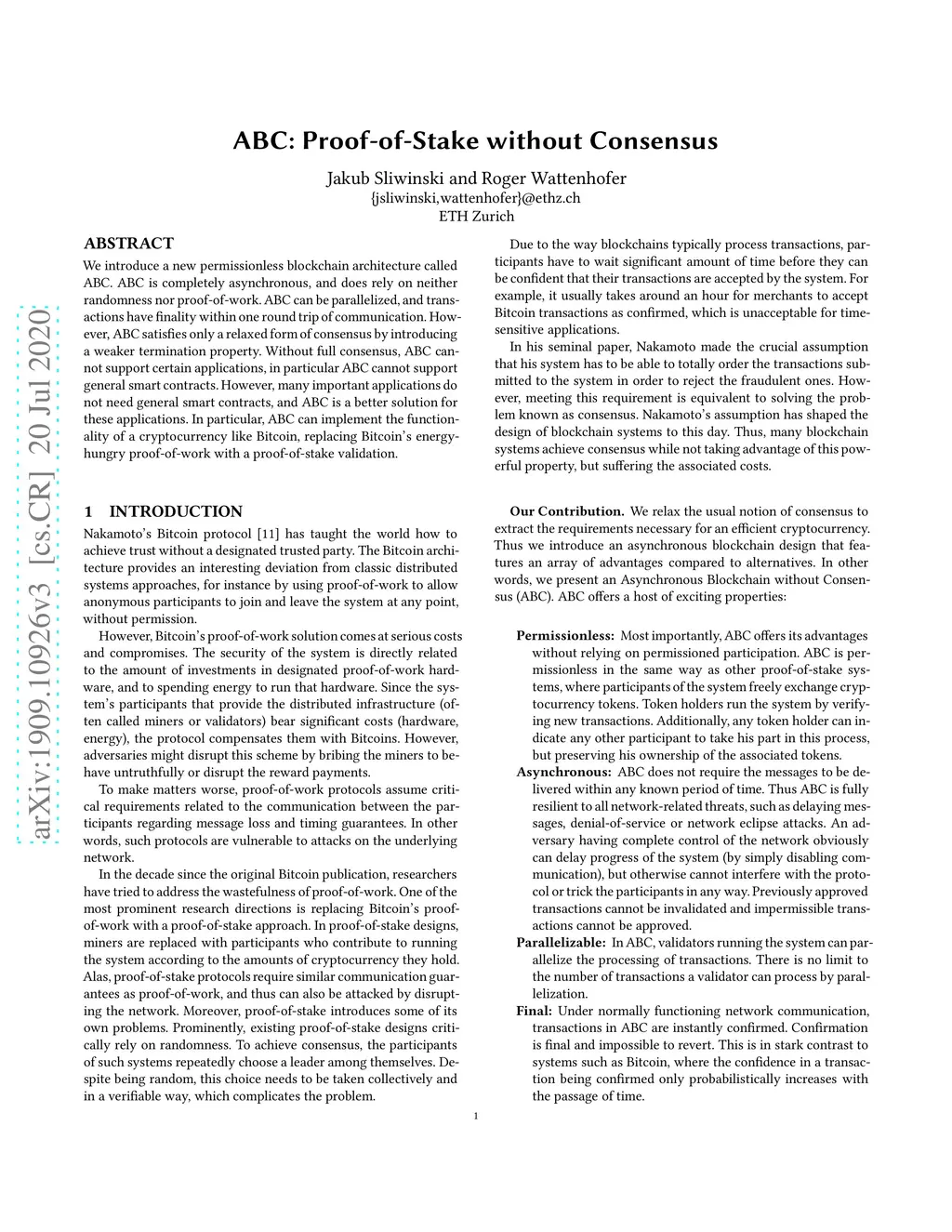 We relax the definition of consensus for the purpose of an efficient cryptocurrency and introduce a new blockchain architecture called ABC that offers the typical functionality of a cryptocurrency. By foregoing the assumption of establishing consensus, we are able to design ABC with an array of advantages compared to typical blockchain protocols: ABC is permissionless, deterministic, and resilient to complete asynchrony. ABC features finality and does not rely on wasteful proof-of-work. Without establishing consensus, ABC cannot support certain applications, in particular smart contracts that are open for interaction with unknown agents. However, our system is an advantageous solution for many important use cases, such as cryptocurrencies like Bitcoin.