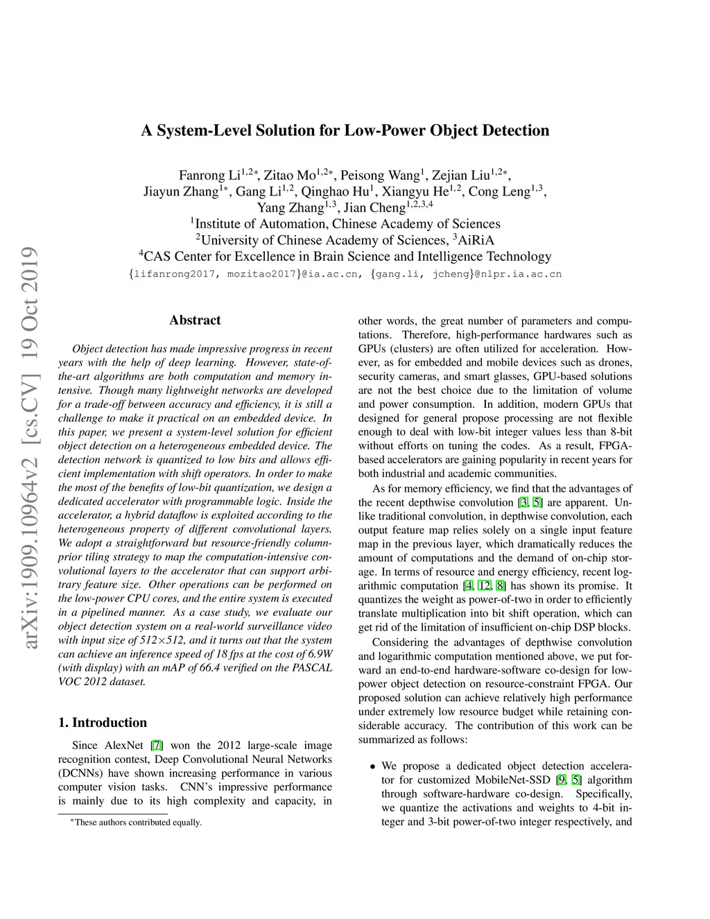 Object detection has made impressive progress in recent years with the help of deep learning. However, state-of-the-art algorithms are both computation and memory intensive. Though many lightweight networks are developed for a trade-off between accuracy and efficiency, it is still a challenge to make it practical on an embedded device. In this paper, we present a system-level solution for efficient object detection on a heterogeneous embedded device. The detection network is quantized to low bits and allows efficient implementation with shift operators. In order to make the most of the benefits of low-bit quantization, we design a dedicated accelerator with programmable logic. Inside the accelerator, a hybrid dataflow is exploited according to the heterogeneous property of different convolutional layers. We adopt a straightforward but resource-friendly column-prior tiling strategy to map the computation-intensive convolutional layers to the accelerator that can support arbitrary feature size. Other operations can be performed on the low-power CPU cores, and the entire system is executed in a pipelined manner. As a case study, we evaluate our object detection system on a real-world surveillance video with input size of 512x512, and it turns out that the system can achieve an inference speed of 18 fps at the cost of 6.9W (with display) with an mAP of 66.4 verified on the PASCAL VOC 2012 dataset.