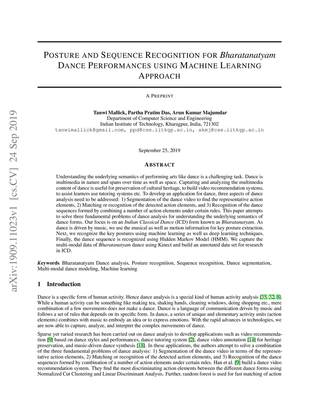 Posture and sequence recognition for Bharatanatyam dance performances